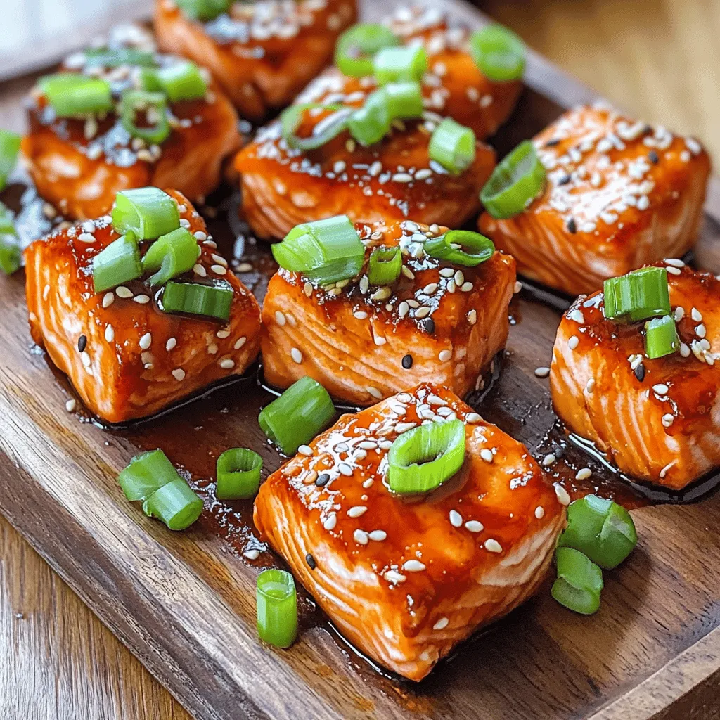 Gather these ingredients for a fun and tasty snack. The salmon fillet is the star here. Use fresh salmon for the best flavor and texture. The teriyaki sauce adds a sweet and savory touch. Sesame oil brings a nutty flavor, which makes this dish special. Fresh ginger and garlic enhance the taste. A sprinkle of salt and pepper is all you need to season the salmon bites. For a lovely finish, we will garnish with green onions and sesame seeds. This step is simple but makes your dish look great!