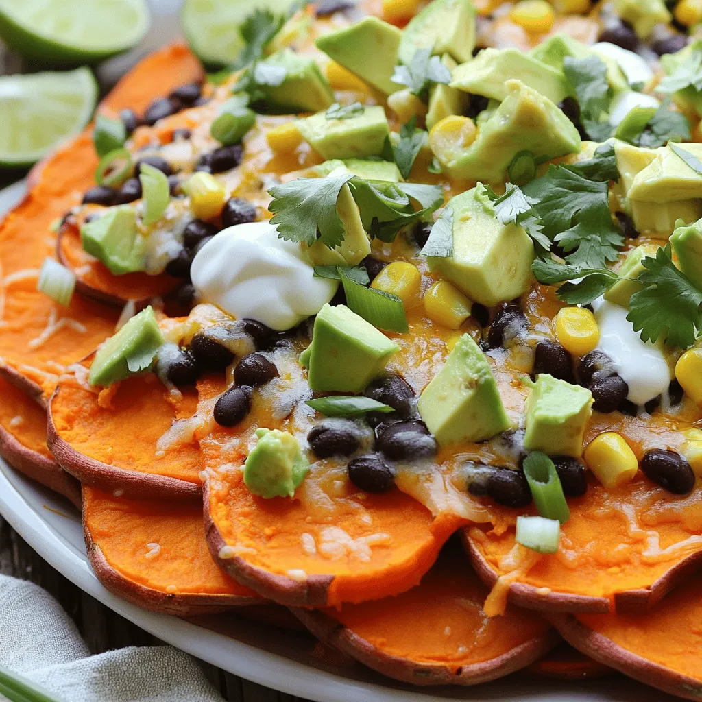 To make baked sweet potato nachos healthy, use fresh ingredients. Choose ripe avocados, fresh tomatoes, and low-sodium black beans. Cut down on cheese or use a lighter option. You can also swap sour cream for Greek yogurt for added protein. Adding more veggies boosts fiber and nutrients.