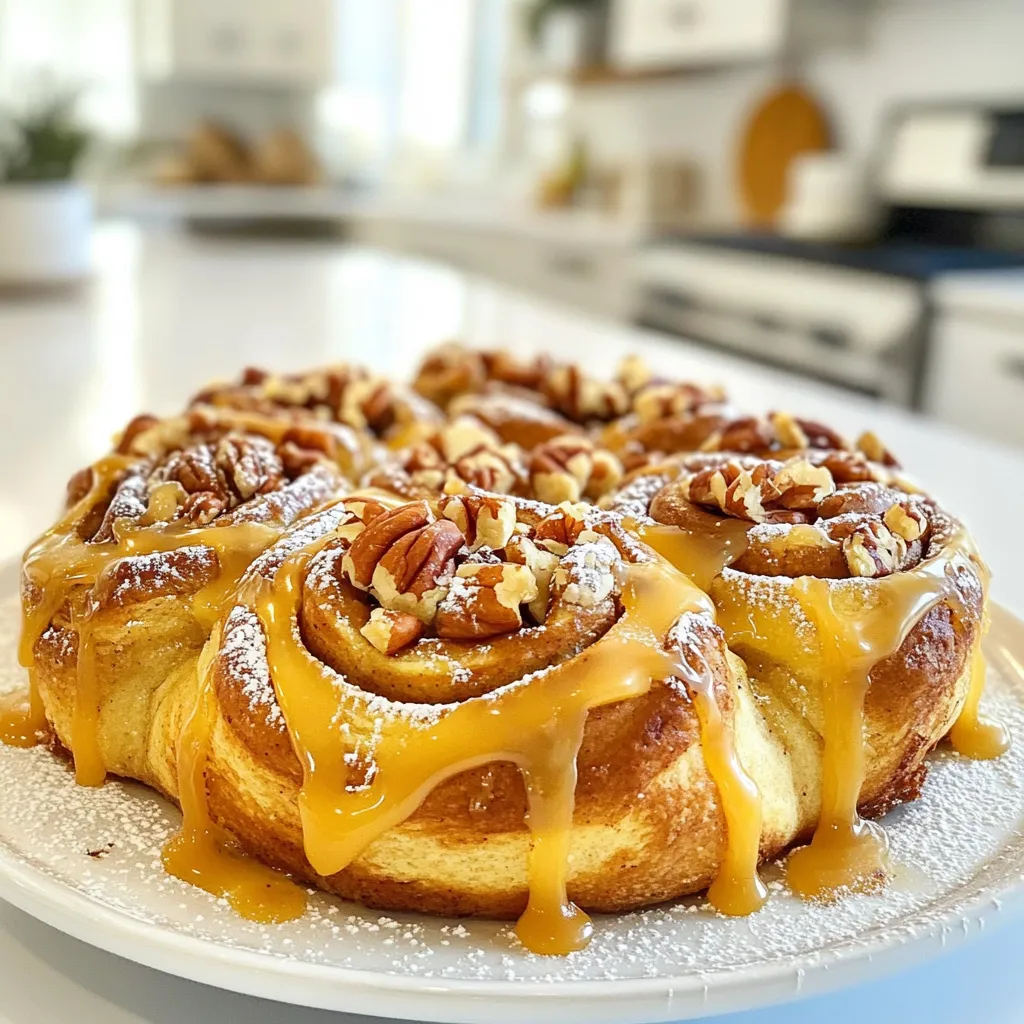 Delicious cinnamon rolls filled with caramel, pecans, and a hint of cinnamon, topped with a sweet icing.