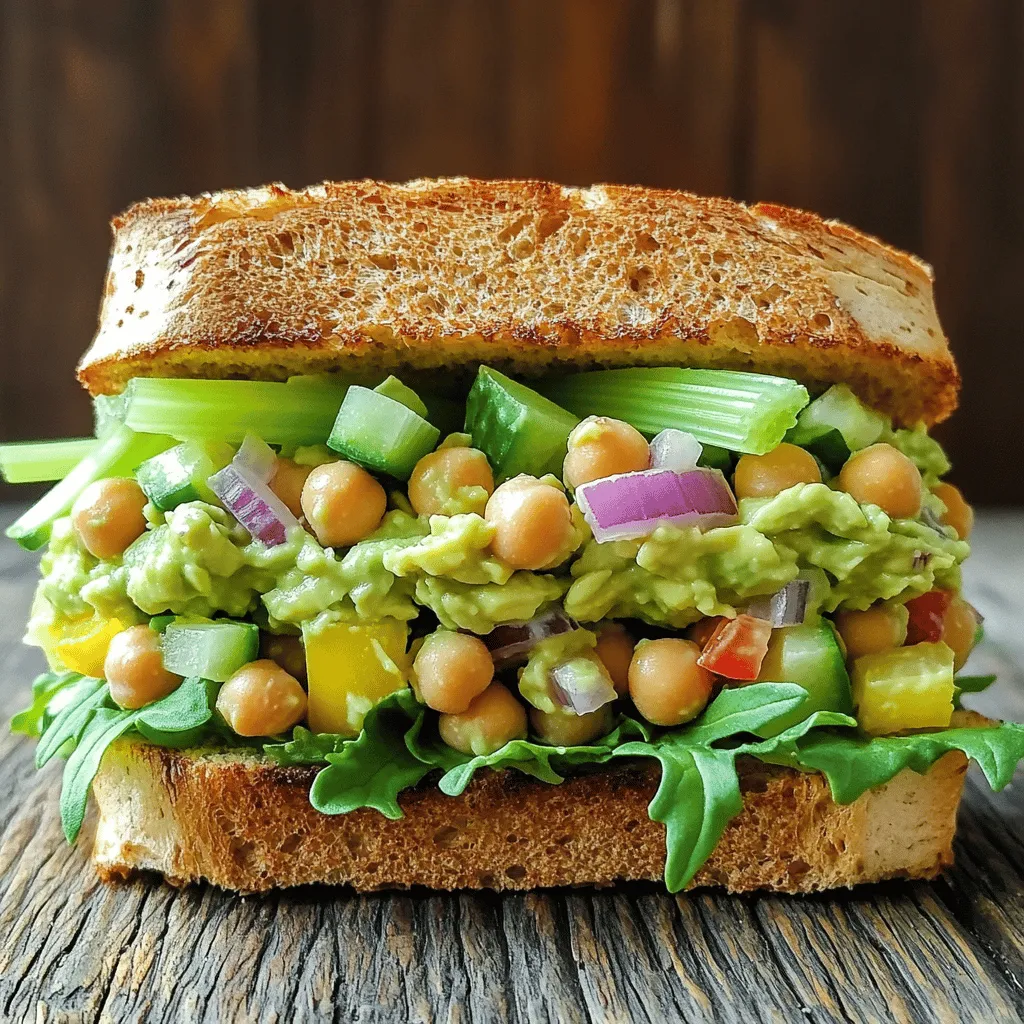 - 1 can chickpeas - 1 ripe avocado - Fresh chopped vegetables (red onion, celery, bell pepper) You will need a can of chickpeas. This is the star of your sandwich. Chickpeas are rich in protein and fiber. They provide a hearty base. Next, grab a ripe avocado. Its creamy texture blends well and adds richness. Finally, chop some fresh vegetables. Red onion, celery, and bell pepper add crunch and color. - Lemon juice - Tahini - Salt and pepper For flavor, use fresh lemon juice. It adds brightness and balances the creaminess. You can add tahini too for a nutty taste. Salt and pepper will enhance the flavors. Adjust these to fit your taste. - Whole grain bread - Leafy greens (spinach, arugula) Whole grain bread makes a great base. It adds fiber and keeps you full. You can use leafy greens like spinach or arugula for added nutrition. These greens bring freshness and color to your sandwich. First, take one can of chickpeas. Drain and rinse them well. In a mixing bowl, add the drained chickpeas and one ripe avocado. Use a fork to mash the avocado and chickpeas together. You want a chunky texture, so don’t mash them too much. Next, chop 1/4 cup of red onion, 1/4 cup of celery, and 1/4 cup of bell pepper. Add these chopped veggies to your bowl. Mix everything together until it is well combined. This adds a nice crunch to your salad. Now, it’s time to add flavor. Drizzle in 1 tablespoon of fresh lemon juice. If you like, add 1 tablespoon of tahini for a creamier texture. Stir the mixture until all the ingredients are coated. Taste the salad and add salt and pepper as needed. This step is key to making it delicious. Toast 4 slices of whole grain bread until they turn golden brown. While the bread is toasting, prepare to layer your sandwich. Take one slice of toasted bread and add a generous scoop of the chickpea avocado salad. Next, add a handful of leafy greens, like spinach or arugula. Top it off with another slice of bread. Press down gently to hold everything in place. Finally, slice the sandwich in half and enjoy your tasty meal right away! To get that perfect chunky consistency, start with a fork. Lightly mash the chickpeas and avocado together in a bowl. Leave some chickpeas whole for bite. This adds a nice texture. The right ingredient ratio is key. Use one ripe avocado for every can of chickpeas. This keeps your salad creamy but not too wet. Want to spice things up? Consider adding cumin or paprika. They bring warmth and depth to the salad. If you don’t have tahini, try using Greek yogurt or almond butter. Both add creaminess and a unique flavor twist. Pair your sandwich with a side of fresh fruit or veggie sticks. This balances the meal and adds color. For drinks, iced tea or sparkling water makes a great match. To make your sandwich look pretty, add a few leafy greens. A layer of spinach or arugula peeking out adds a fresh pop. Slice the sandwich on a diagonal for a nice touch. {{image_2}} You can change up your chickpea avocado salad sandwich in many fun ways. Try adding cucumbers for a fresh crunch. Carrots also work well for sweetness and color. If you want to skip the avocado, use hummus or a nut butter instead. These options still give you a creamy texture and great flavor. For those who follow a vegan diet, this recipe is perfect as is. Chickpeas and veggies are always vegan-friendly. If you need a gluten-free option, swap the whole grain bread for gluten-free bread. You still get all the taste without the gluten! Want to try something new? Make chickpea salad wraps! Use large lettuce leaves to hold the salad instead of bread. This keeps it light and fresh. You can also create chickpea avocado salad bowls. Just add a scoop of the salad to a bowl and top it with your favorite toppings, like nuts or seeds. Enjoy the same flavors in a fun new way! To keep your Chickpea Avocado Salad Sandwich fresh, wrap it tightly in plastic wrap. You can also store it in an airtight container. Refrigerate any leftovers within two hours. The salad mixture can stay good for up to three days in the fridge. Always separate the salad from the bread if you want to maintain crispness. If you want to enjoy this salad later, you can freeze the chickpea mixture. Place it in a freezer-safe container. It will stay fresh for up to three months. When you are ready, thaw it in the fridge overnight. For reheating, use a microwave on low power. This helps keep the flavors intact. The Chickpea Avocado Salad Sandwich lasts about two days in the fridge. Watch for signs of spoilage, like a sour smell or discoloration. If the avocado turns brown or mushy, it's time to toss it. Always check the salad mixture before eating to ensure it is safe. Making this sandwich is quick! It takes about 10 minutes to prep and 5 minutes to assemble. That gives you a total of 15 minutes from start to finish. You’ll love how fast it is! Yes, you can! You can prepare the chickpea avocado salad ahead of time. Store it in an airtight container in the fridge. It stays fresh for up to 2 days. Just make sure to add the salad to the bread right before eating. This keeps the bread nice and crunchy. Absolutely! This sandwich is packed with nutrition. Chickpeas are high in protein and fiber, which help keep you full. They also support heart health. Avocados are rich in healthy fats, vitamins, and minerals. They help improve skin health and provide energy. Overall, this sandwich is a tasty and healthy option for any meal! This blog post highlights how to create a delicious Chickpea Avocado Salad Sandwich. You learned about the key ingredients, including chickpeas, avocado, and fresh veggies, and how to mix them with spices and seasonings. I shared tips for achieving the best texture and flavor, plus serving ideas and storage methods. In conclusion, you can enjoy this tasty sandwich in many ways. Remember, the options are endless. Customize it to fit your taste and dietary needs. Get creative and make it your own!