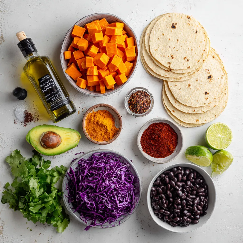 These main ingredients create a rich and smoky flavor. Sweet potatoes bring sweetness and texture. Olive oil helps with roasting. Chipotle powder adds heat and depth. Tortillas hold everything together.