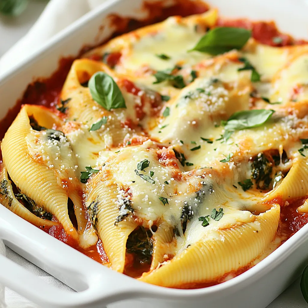 - 20 jumbo pasta shells - 2 cups fresh spinach, chopped - 1 cup ricotta cheese - 1 cup shredded mozzarella cheese, plus extra for topping - 1/2 cup grated Parmesan cheese - 1 egg, beaten - 1 teaspoon minced garlic - 1 tablespoon olive oil - 2 cups marinara sauce - Salt and pepper to taste - Fresh basil for garnish (optional) You can swap ricotta cheese for cottage cheese. This change gives a similar creamy texture. If you want a lighter option, use low-fat ricotta. You can also replace the mozzarella with provolone for a different flavor. For the marinara, homemade sauce works well too. If you need it dairy-free, try cashew cream instead of cheese. Choose spinach that is bright green and crisp. Avoid any leaves that are wilted or yellow. When picking cheeses, look for creamy textures and fresh smells. Buy mozzarella and ricotta from a trusted brand. For the marinara, choose a sauce with simple ingredients. Always check the expiration dates to ensure freshness. {{ingredient_image_1}} First, gather all your ingredients. You need 20 jumbo pasta shells, 2 cups of chopped spinach, and 1 cup each of ricotta and shredded mozzarella cheese. Don’t forget 1/2 cup of grated Parmesan cheese, 1 beaten egg, and some minced garlic. You also need olive oil, marinara sauce, salt, and pepper. Next, preheat your oven to 375°F (190°C). This helps your dish cook evenly. Bring a large pot of salted water to a boil. Add the pasta shells and cook according to the package instructions. Aim for al dente, so they hold their shape. Drain the shells and set them aside. Now, heat olive oil in a skillet over medium heat. Add the minced garlic and let it cook for about 1 minute. The garlic should smell great. Then, add the chopped spinach to the skillet and cook until it wilts. Remove it from heat and let it cool a bit. In a large bowl, mix the ricotta, 1 cup of mozzarella, grated Parmesan, beaten egg, wilted spinach, salt, and pepper. Make sure everything is well combined. Stuffing the shells is next. Take each shell and fill it with the spinach-ricotta mixture. Place each filled shell in a greased baking dish. Repeat this step until all shells are filled. Pour marinara sauce evenly over the stuffed shells. Make sure each shell is well covered. Then, sprinkle the remaining mozzarella cheese on top. This will give a nice cheesy crust. Cover the baking dish with foil to keep moisture in. If you spray the foil with cooking spray, it won't stick. Bake for 25 minutes. After that, remove the foil and bake for another 10 minutes. You want the cheese to be bubbly and golden. Prep time for this dish is about 20 minutes, and total cooking time is around 1 hour. To save time, chop the spinach and garlic while the pasta cooks. Mixing the filling can happen while the pasta cools. If you prep ahead, this dish will come together quickly. Enjoy the process and the delicious results! When making creamy spinach ricotta stuffed shells, avoid overcooking the pasta. Cook it al dente, or firm to the bite. If you overcook, the shells will break. Next, don’t skip cooling the spinach before mixing. Hot spinach can cook the egg in the filling. Lastly, cover your dish with foil while baking. This helps the cheese melt evenly without burning. To boost the flavor, add more spices. A pinch of nutmeg gives a warm taste. Fresh herbs like thyme or parsley brighten the dish. If you prefer a kick, sprinkle in some red pepper flakes. Experiment with different cheeses too. A bit of goat cheese or feta can add a tangy twist. Mixing in sautéed onions or mushrooms can also create a richer flavor. These stuffed shells shine with a fresh salad on the side. A simple green salad with lemon vinaigrette balances the creaminess. Garlic bread pairs well too, perfect for soaking up extra sauce. You can also add a sprinkle of fresh basil on top before serving. This adds color and a fresh taste. For a hearty meal, serve with a side of roasted vegetables, like zucchini or bell peppers. Pro Tips Use Fresh Spinach: Fresh spinach provides a vibrant flavor and better texture compared to frozen spinach. Make sure to wash and chop it just before cooking. Egg for Binding: The beaten egg in the filling helps bind the ingredients together, making it easier to stuff the shells and preventing them from falling apart during baking. Extra Cheese Topping: Don’t skip the extra mozzarella on top! It creates a delightful golden crust and adds more cheesy goodness to each bite. Let it Rest: Allow the stuffed shells to cool for a few minutes before serving. This helps the filling set and makes them easier to serve without spilling. {{image_2}} You can change the filling for stuffed shells easily. Try adding cooked ground meat, like beef or turkey. This adds protein and flavor. You can also use sautéed mushrooms for an earthy taste. Artichokes or sun-dried tomatoes provide a tasty twist. For a spicy kick, add some red pepper flakes. Mix and match your favorite ingredients to make it your own. If you need gluten-free stuffed shells, look for gluten-free pasta shells. Many stores offer these now. You can also make your own shells using almond flour or rice flour. This way, you enjoy the same creamy goodness without gluten. Just be sure to check the labels to avoid hidden gluten in sauces. To make this dish vegan, replace ricotta cheese with a tofu blend. You can mash firm tofu and mix it with nutritional yeast for a cheesy flavor. Use a plant-based mozzarella made from cashews or almonds. For the egg, use a flaxseed meal slurry as a binder. This keeps your dish creamy and delicious while being kind to animals. To store leftover creamy spinach ricotta stuffed shells, first let them cool. Place them in an airtight container. Make sure to cover the shells with marinara sauce to keep them moist. They will stay fresh in the fridge for up to three days. You can freeze these stuffed shells for later. After assembling, but before baking, wrap the dish tightly in plastic wrap. Then, cover 