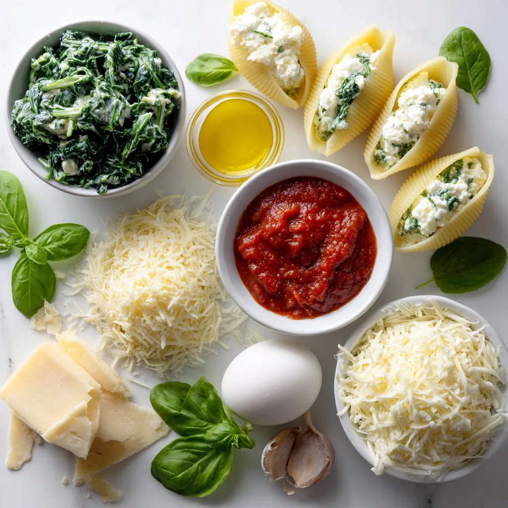 First, gather all your ingredients. You need 20 jumbo pasta shells, 2 cups of chopped spinach, and 1 cup each of ricotta and shredded mozzarella cheese. Don’t forget 1/2 cup of grated Parmesan cheese, 1 beaten egg, and some minced garlic. You also need olive oil, marinara sauce, salt, and pepper.