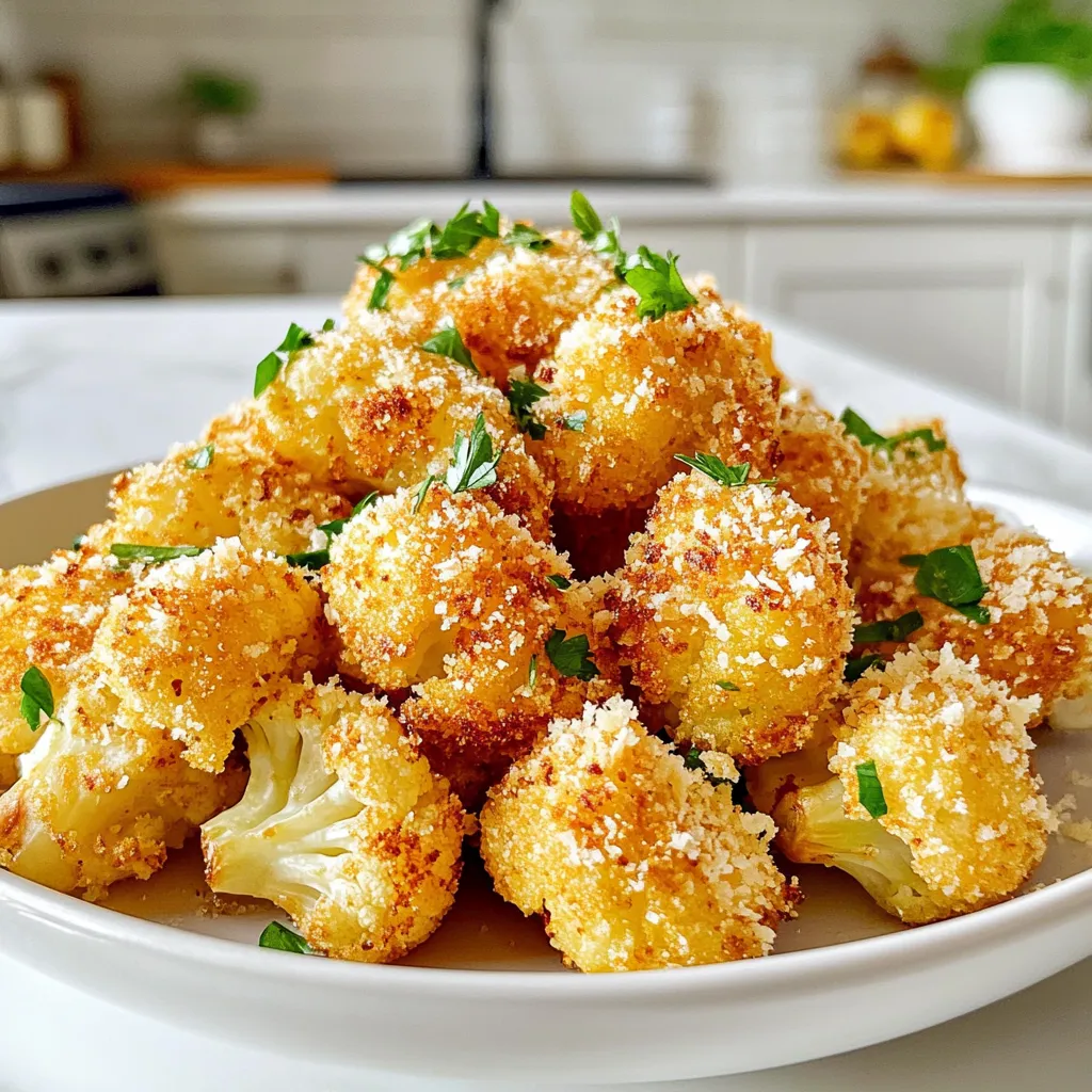To make this tasty dish, you will need: - 1 medium head of cauliflower, cut into florets - 1 cup breadcrumbs (panko for extra crispiness) - 1/2 cup grated Parmesan cheese - 2 teaspoons garlic powder - 1 teaspoon paprika - 1/2 teaspoon black pepper - 1/2 teaspoon salt - 2 large eggs - 1/4 cup milk (dairy or plant-based) - Fresh parsley, chopped (for garnish) These ingredients create a great base for crispy cauliflower. The key is the panko breadcrumbs and Parmesan cheese, which give the florets that delightful crunch. You can add more flavor with these extras: - Lemon zest for a bright taste - Cayenne pepper for heat - Onion powder for depth These options can make your dish more exciting. Feel free to mix and match based on your taste. If you need to switch any ingredients, here are some ideas: - Use nutritional yeast instead of Parmesan for a vegan option. - Substitute egg with a flax egg (1 tablespoon flaxseed meal + 2.5 tablespoons water). - Choose gluten-free breadcrumbs if you need a gluten-free dish. These substitutions ensure everyone can enjoy this recipe. Remember, cooking is all about finding what works for you! {{ingredient_image_1}} Start by cutting your medium head of cauliflower into small florets. Aim for even sizes so they cook the same. Rinse them under cold water and dry them well with a clean towel. This helps the coating stick better. Preheat your air fryer to 375°F (190°C) while you work on the next steps. In a large bowl, combine breadcrumbs, grated Parmesan cheese, garlic powder, paprika, black pepper, and salt. Mix these ingredients well. In a separate bowl, whisk together the eggs and milk until smooth. Take each cauliflower floret and dip it into the egg mixture. Let any extra egg drip off. Then, coat it in the breadcrumb mix. Press lightly to make sure it sticks. This double-dipping helps create a crispy texture. Place the coated florets in the air fryer basket in a single layer. If your air fryer is small, cook in batches. Air fry the cauliflower for 15-20 minutes. Halfway through, shake the basket to turn the florets for even cooking. They should turn golden brown and crispy when ready. Once done, remove them carefully and transfer to a serving dish. Garnish with chopped fresh parsley for a nice touch before serving. Enjoy this easy and tasty treat! To get your cauliflower crispy, make sure you use panko breadcrumbs. They create a great crunch. Keep your florets dry before coating them. Too much moisture makes them soggy. When you coat them, press the breadcrumb mix on gently. This helps it stick well. Air frying at 375°F (190°C) is key. Don’t overcrowd the basket; give them space to breathe. Shake the basket halfway through cooking for even crispiness. One common mistake is skipping the egg wash. The egg helps the breadcrumbs stick better. Another error is not preheating the air fryer. This step is vital for even cooking. Also, avoid using regular breadcrumbs; they won’t give the same crunch. If you don’t shake the basket, some florets may not cook evenly. Lastly, don’t rush the cooking time; let them fry until golden brown. Crispy air fryer cauliflower is great on its own, but you can make it even better. Try serving it with a spicy dipping sauce like sriracha mayo. It also pairs well with ranch or garlic aioli. For a full meal, serve it alongside grilled chicken or fish. You can make a fun cauliflower bowl with grains, greens, and your favorite protein. Garnish with fresh parsley for added flavor and color. Pro Tips Choose Fresh Cauliflower: Select a medium head of cauliflower that is firm and has tightly packed florets for the best texture and flavor. Use Panko Breadcrumbs: Opt for panko breadcrumbs instead of regular breadcrumbs to achieve an extra crispy coating. Preheat the Air Fryer: Make sure to preheat your air fryer to ensure even cooking and optimal crispiness of the cauliflower. Don’t Overcrowd the Basket: Air fry in batches if necessary; overcrowding can lead to uneven cooking and soggy florets. {{image_2}} To make a spicy version, add heat to your cauliflower. Mix in 1-2 teaspoons of cayenne pepper with the breadcrumbs. This gives your dish a nice kick. You can also toss the cooked florets in a spicy sauce. Try sriracha or buffalo sauce for extra flavor. The crunch pairs well with the heat. For a cheesy twist, increase the Parmesan to 3/4 cup. Add 1 teaspoon of garlic powder to the breadcrumb mix. You can also sprinkle some shredded mozzarella on top after cooking. Return the cauliflower to the air fryer for an extra 2-3 minutes. The cheese will melt and create a delicious layer. For a vegan-friendly option, swap the eggs and milk with plant-based choices. Use a flax egg made from 1 tablespoon of ground flaxseed and 2.5 tablespoons of water. Let it sit for a few minutes to thicken. You can also use almond or oat milk in place of dairy milk. This keeps the crispy texture while being plant-based. Store any leftover crispy cauliflower in an airtight container. Make sure it cools first. Keep it in the fridge for up to three days. You can also place parchment paper between layers to keep it crispy. To reheat, use the air fryer again. Set it to 350°F (175°C). Heat for about 5 to 7 minutes. This helps maintain the crunch. You can also use an oven at the same temperature. Just keep an eye on it to avoid sogginess. For freezing, let the cooked cauliflower cool completely. Place it in a freezer-safe bag or container. Make sure to remove as much air as possible. It can last for up to three months in the freezer. When ready to eat, thaw it in the fridge overnight. Reheat in the air fryer for best texture. Yes, you can make crispy air fryer cauliflower without eggs. Use a mix of flour and water instead. This helps the breadcrumbs stick well. You can also use a plant-based milk for a lighter option. The result is still crunchy and tasty. To keep your cauliflower crispy, make sure to dry it well. Pat the florets with a paper towel after washing