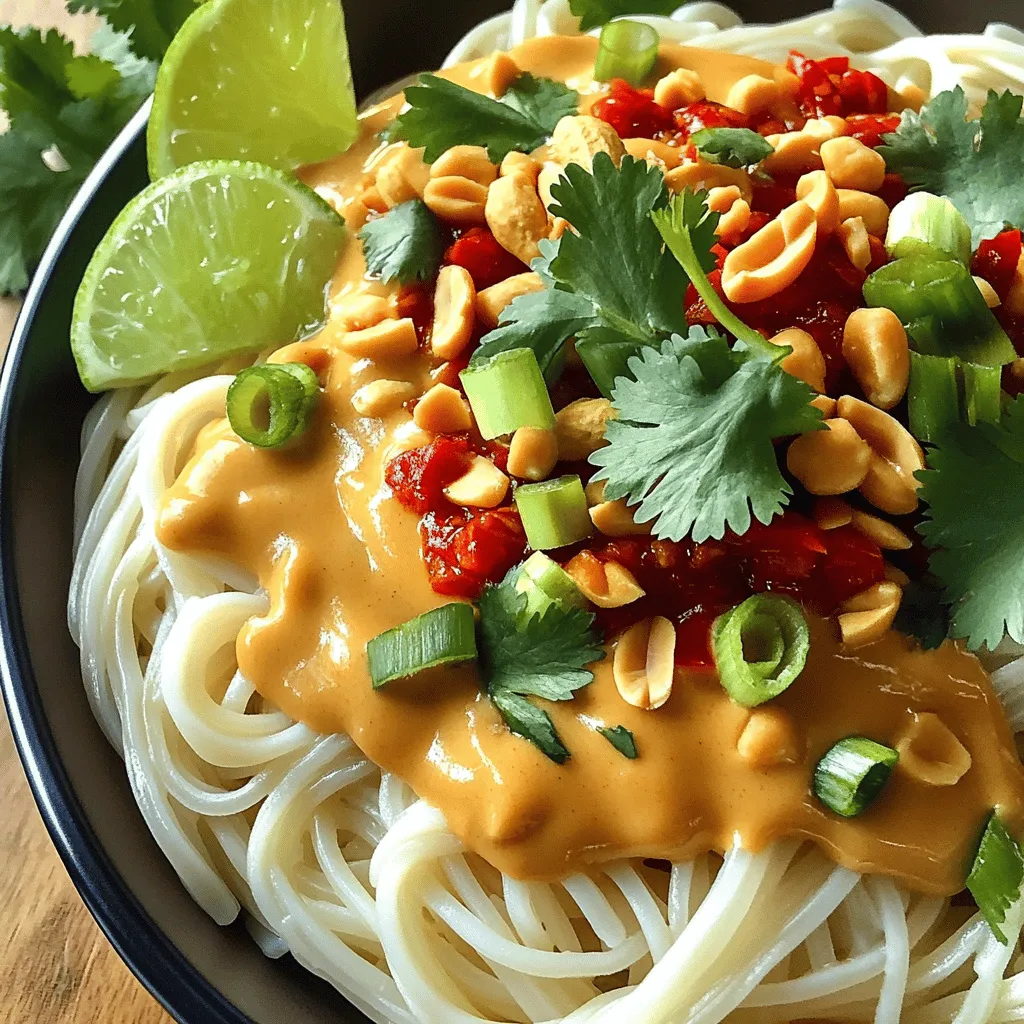 Heat a large skillet over medium heat. Add the cooked rice noodles to the pan. Pour the peanut sauce over them. Toss everything well to coat the noodles. Cook for about 2-3 minutes until warm. Remove from heat. Stir in 2 sliced green onions and half of the chopped roasted peanuts. This adds crunch and flavor. Plate the noodles. Top with the rest of the peanuts and some fresh cilantro. Serve with lime wedges for an extra burst of flavor. Enjoy your quick and tasty meal!