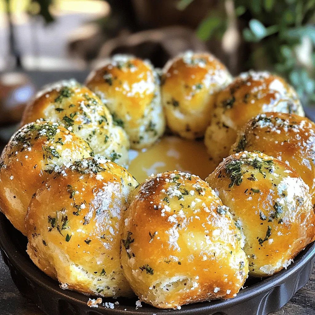 - Flour and Yeast - 3 cups all-purpose flour - 1 packet (2 ¼ teaspoons) active dry yeast - Butter and Oil - ¼ cup unsalted butter, melted - 1 tablespoon olive oil - 1 cup warm water (110°F) - Fresh Herbs and Garlic - 4 cloves garlic, minced - 2 tablespoons fresh parsley, chopped - 1 tablespoon fresh rosemary, chopped - 1 tablespoon fresh thyme, chopped - Cheese and Seasoning - ¼ cup granulated sugar - 1 teaspoon salt - ½ teaspoon black pepper - ½ cup grated Parmesan cheese Gather these ingredients to make your garlic herb monkey bread. Each item adds flavor and texture. The combination of fresh herbs and garlic makes this bread highly aromatic and tasty. The cheese adds a savory touch and makes it melt in your mouth. You will love how easy this recipe is. The dough comes together quickly. Just mix the ingredients and let them rise. You will create a soft, fluffy bread that pulls apart easily. This dish is perfect for sharing or serving at gatherings. Enjoy the fun of pulling apart each piece. Activating the Yeast Start by mixing warm water with sugar and yeast. This helps the yeast grow. Let it sit for 5-10 minutes. You will see bubbles on top when it's ready. Mixing Dry Ingredients In a separate bowl, mix the flour and salt. Make a small well in the center. This is where you will add the wet mix. Combining Ingredients Now, pour the yeast mix, melted butter, and olive oil into the well. Stir this until it forms a dough. Kneading Technique Put the dough on a floured surface. Knead it for 5-7 minutes. You want it smooth and elastic. Don’t rush; this step is key. First Rise Place the kneaded dough in a greased bowl. Cover it with a damp towel. Let it rise in a warm spot until it doubles in size, which takes about 1 hour. Preparing the Garlic Herb Coating While the dough rises, mix the minced garlic, parsley, rosemary, thyme, black pepper, and Parmesan cheese in a bowl. This will give your bread great flavor. Shaping Dough Balls After the first rise, punch down the dough. Divide it into small pieces, about 1 inch each. Roll each piece into a ball. Arranging in Bundt Pan Dip each ball in the garlic herb mix, coating it well. Place the coated balls in a greased bundt pan. Stack them up nicely. Preheating the Oven Before you bake, preheat your oven to 350°F (175°C). This step is important for even cooking. Baking Time and Temperature Bake the monkey bread for 30-35 minutes. Look for a golden brown color on top. Cooling Before Serving After baking, let it cool for a few minutes. Then invert it onto a plate. Serve warm for the best taste! Temperature Considerations Warm water helps the yeast wake up. Aim for 110°F. Too hot kills the yeast. Too cold slows it down. Always check the water’s warmth before mixing. Ensuring Dough Rises Properly Dough needs a warm, draft-free space to rise. Use a towel to cover it. This keeps the heat in. A good rise takes about one hour. If your kitchen is cold, try placing the bowl near a warm oven. Achieving the Best Flavor Fresh herbs add great taste. I love using parsley, rosemary, and thyme. Mix them with minced garlic and Parmesan cheese. This blend gives the bread a rich, savory flavor. Serving Suggestions Serve the bread warm. Drizzle with melted butter for extra flavor. Sprinkle fresh herbs on top for color. This makes the dish look inviting. Use a nice plate to display your creation. Using Dipping Sauces Pair the monkey bread with dipping sauces. Marinara or garlic butter work well. Small bowls make it easy for guests to dip. This adds fun and flavor to your meal. {{image_2}} Adding Cheese Variants You can add many types of cheese to your monkey bread. Cheddar, mozzarella, or feta all work great. Cheese gives the bread a nice, gooey texture. Simply mix the cheese into the garlic herb blend. This adds flavor and richness. Other Herbs and Seasonings Feel free to swap out the herbs in the recipe. Basil, oregano, or dill can add a unique twist. You can also add a pinch of chili flakes for heat. Mixing and matching herbs lets you create your perfect flavor. Gluten-Free Alternatives If you need a gluten-free option, use gluten-free flour. Brands like Bob’s Red Mill offer great blends. Just follow the same steps in the recipe. The bread may have a different texture, but it will still taste great. Vegan Substitutions To make this recipe vegan, replace butter with a plant-based option. You can use coconut oil or vegan butter. For the cheese, try nutritional yeast or a vegan cheese. These changes keep the flavor while making it suitable for everyone. - Refrigerating Leftovers: Let your garlic herb monkey bread cool completely. Wrap it in plastic wrap or foil. Place it in an airtight container. It will stay fresh in the fridge for up to three days. - Freezing Options: For longer storage, you can freeze monkey bread. Wrap the cooled bread tightly in plastic wrap, then foil. Label it with the date. It can last in the freezer for up to three months. - Oven vs. Microwave: The oven gives the best results. Preheat your oven to 350°F (175°C). Unwrap the bread and place it on a baking sheet. Heat for about 10-15 minutes until warm. If you're short on time, you can use the microwave. Place a single piece on a microwave-safe plate. Heat for 15-20 seconds. Be careful, as it can become chewy if overcooked. Enjoy your delicious garlic herb monkey bread any time with these simple storage and reheating tips! It takes about two hours to make garlic herb monkey bread. This includes prep time and the rising time for the dough. Setting aside 20 minutes for prep and about 1 hour for the first rise is key. The second rise takes another 30-45 minutes. Finally, you bake it for 30-35 minutes. Yes, you can use different herbs in this recipe. If you prefer basil or oregano, feel free to swap them in. Fresh herbs add great flavor, but dried herbs work too. Just use less of them since dried herbs are stronger. To make monkey bread ahead of time, prepare the dough and shape it into