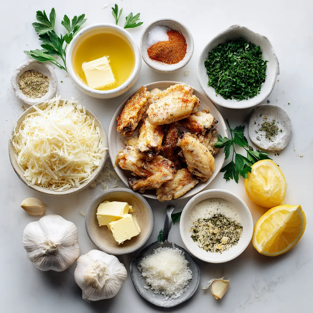 To make Garlic Parmesan Chicken Wings, you need fresh chicken wings. The best choice is 2 pounds of wings. They will give you a good amount to share. You will also need unsalted butter. Four tablespoons of melted butter adds rich flavor. Garlic is key in this dish. Use one tablespoon of minced garlic for that strong taste.