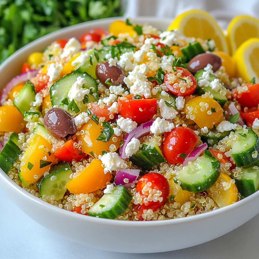 To make this tasty Greek quinoa salad, you will need: - 1 cup quinoa, rinsed - 2 cups water - 1 cucumber, diced - 1 cup cherry tomatoes, halved - 1 red bell pepper, diced - 1/2 red onion, finely chopped - 1 cup Kalamata olives, pitted and halved - 1/2 cup feta cheese, crumbled - 1/4 cup fresh parsley, chopped - 3 tablespoons olive oil - 2 tablespoons lemon juice - 1 teaspoon dried oregano - Salt and pepper to taste You can make this salad your own by changing some ingredients. Here are some ideas: - Swap quinoa for bulgur or farro for a different grain. - Use any type of olives you like, such as green olives. - If you don’t like feta, try goat cheese or skip the cheese. - Add a splash of red wine vinegar for extra flavor. - Use fresh herbs like dill or mint instead of parsley. Each serving of this salad packs a nutritious punch. Here’s what you get: - Calories: 250 - Protein: 8g - Carbohydrates: 30g - Dietary Fiber: 5g - Total Fat: 12g - Saturated Fat: 3g - Calcium: 100mg - Iron: 2mg This Greek quinoa salad is fresh and filling. It’s perfect for lunch or dinner. You can feel good about what you eat! {{ingredient_image_1}} To cook the quinoa, start with one cup of rinsed quinoa. Place it in a medium saucepan with two cups of water. Bring the water to a boil over medium-high heat. Once it boils, turn the heat down low. Cover the pan and let it simmer for about 15 minutes. The quinoa is done when the water is absorbed and the grains look fluffy. Use a fork to fluff the quinoa gently. Let it cool slightly before mixing with the veggies. While the quinoa cools, you can prepare the vegetables. Dice one cucumber and a red bell pepper. Cut one cup of cherry tomatoes in half. Finely chop half a red onion. Take one cup of Kalamata olives, pit them, and halve them. These colorful veggies add crunch and flavor to the salad. Place all the chopped veggies in a large mixing bowl. Now it’s time to combine the quinoa and veggies. Add the cooled quinoa to the bowl with the vegetables. Crumble half a cup of feta cheese and add it to the mix. In a small bowl, whisk together three tablespoons of olive oil, two tablespoons of lemon juice, one teaspoon of dried oregano, and some salt and pepper. Pour this dressing over the quinoa salad. Mix everything gently until well combined. Just before serving, stir in a quarter cup of fresh chopped parsley for a burst of flavor. Cooking quinoa is easy if you follow a few steps. First, always rinse your quinoa before cooking. Rinsing removes the bitter coating called saponin. Use a fine mesh strainer to rinse it well. Next, use a 2:1 water-to-quinoa ratio. For 1 cup of quinoa, add 2 cups of water. Bring the water to a boil over medium-high heat. Once boiling, lower the heat and cover the pot. Let it simmer for about 15 minutes. After that, check if the water is absorbed. If it is, fluff the quinoa with a fork. This helps separate the grains and makes it light. To make your Greek quinoa salad burst with flavor, focus on the dressing. A simple mix of olive oil, lemon juice, oregano, salt, and pepper adds a zesty touch. Whisk these ingredients together until smooth. Pour the dressing over your salad just before serving. This keeps the veggies fresh and crispy. You can also try adding fresh herbs like mint or dill. They add a lovely twist. If you like spice, a pinch of red pepper flakes works well too. Mixing in some chopped garlic gives a strong flavor kick. Presentation makes your dish more inviting. Serve the salad in a large, shallow bowl. This allows the colors to shine. Garnish with extra parsley on top for a fresh look. Adding lemon wedges on the side brightens the dish and offers a pop of color. For an added touch, consider using a colorful platter. A bright blue or white platter enhances the salad's colors. Arrange the ingredients in groups for a fun effect. This not only looks good but also makes it easy for guests to scoop their portions. Pro Tips Rinse the Quinoa: Rinsing quinoa before cooking helps remove its natural coating, called saponin, which can give a bitter taste. Let It Cool: Allowing the quinoa to cool slightly before mixing it with the vegetables prevents wilting and maintains the crispness of the salad. Customize the Veggies: Feel free to add or substitute your favorite vegetables like bell peppers, zucchini, or even avocados to make the salad your own. Serve Fresh: This salad is best served fresh, but can be stored in the fridge for up to 3 days. Just give it a good stir before serving again! {{image_2}} This Greek quinoa salad is naturally vegetarian. To make it vegan, simply skip the feta cheese. You can use avocado instead for creaminess. It adds good fats and a fresh taste. Another option is to toss in some nuts or seeds. Sunflower seeds or pumpkin seeds work well. They give a nice crunch and extra nutrition. Want to boost the protein? Try adding chickpeas or black beans. They blend well and add texture. You can also use grilled chicken or shrimp for a meatier version. Just cook your protein choice and mix it in with the salad. This makes it a filling meal for lunch or dinner. Feel free to swap in seasonal vegetables. In summer, add zucchini or bell peppers. In fall, try roasted sweet potatoes or butternut squash. These swaps keep the salad fresh and exciting. You can even mix up the herbs! Basil or mint can add a new twist to your salad. This way, you can enjoy new flavors all year long. To keep your Greek quinoa salad fresh, store it in an airtight container. Place it in the fridge. It will stay good for up to three days. Make sure to seal it well to avoid extra moisture. If you notice any liquid forming, drain it before serving. You can freeze the salad, but it may change texture. To freeze, pack it in a freezer-safe container. Leave some space for expansion. It can last up to two months in the freezer. When ready to eat, thaw it in the fridge overnight. Mix it well before serving. Each ingredient has a different shelf life. Quinoa can