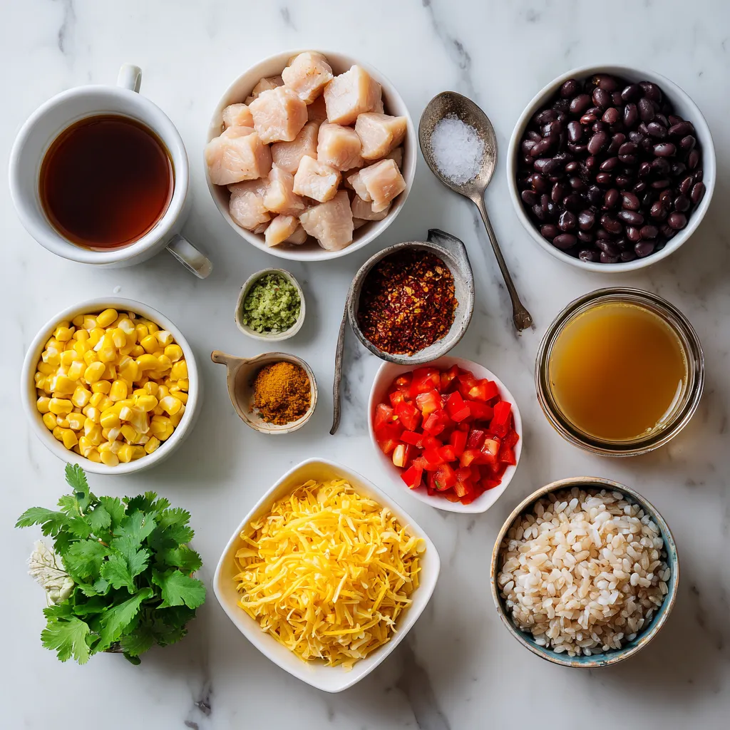 Gather these simple ingredients before you start. The chicken breast gives protein. Brown rice provides a hearty base. Black beans add fiber, and corn brings sweetness. Salsa adds flavor and spice.
