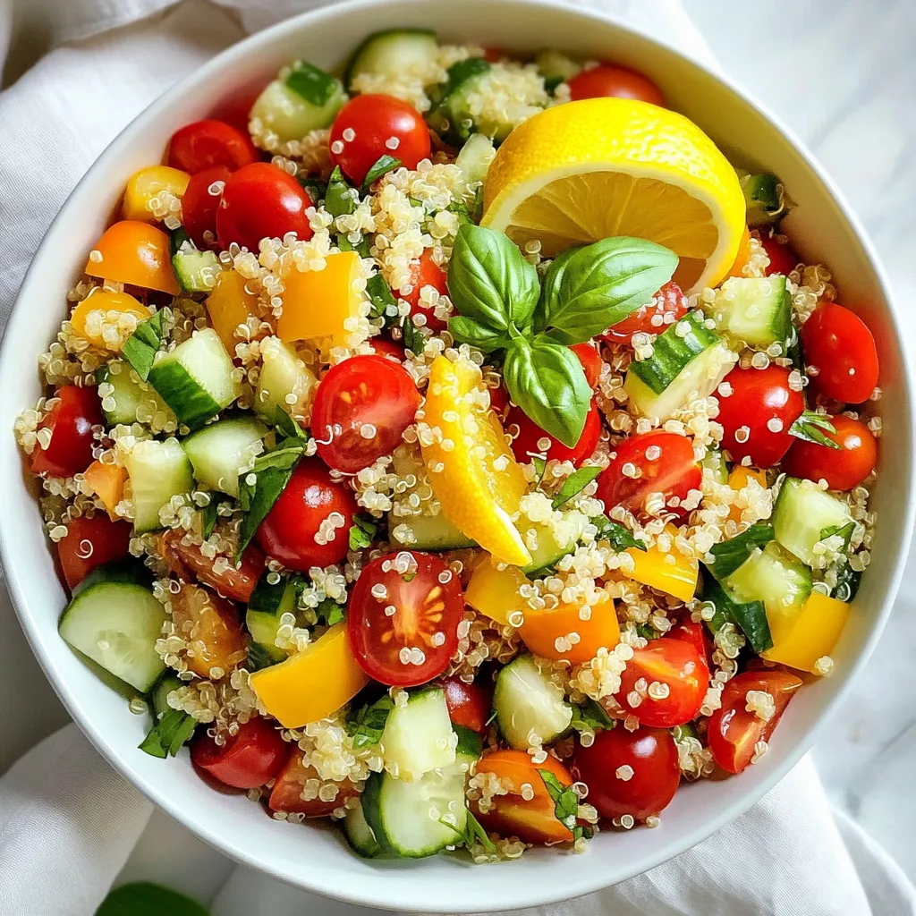A refreshing salad featuring quinoa, fresh vegetables, and a zesty lemon-basil dressing.