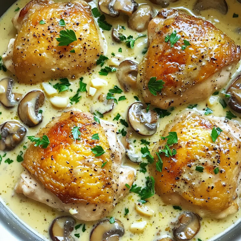Gather these ingredients to make your One-Pan Creamy Mushroom Garlic Chicken. The chicken thighs are juicy and tender. The mushrooms add a rich, earthy flavor, while garlic gives a nice aroma. Heavy cream makes the sauce creamy and smooth. Chicken broth helps to deepen the flavor, along with thyme and paprika. Don’t forget to season with salt and pepper to your liking. Finally, fresh parsley adds a pop of color and freshness. This simple list makes cooking easy and fun. Enjoy making this dish with fresh ingredients!