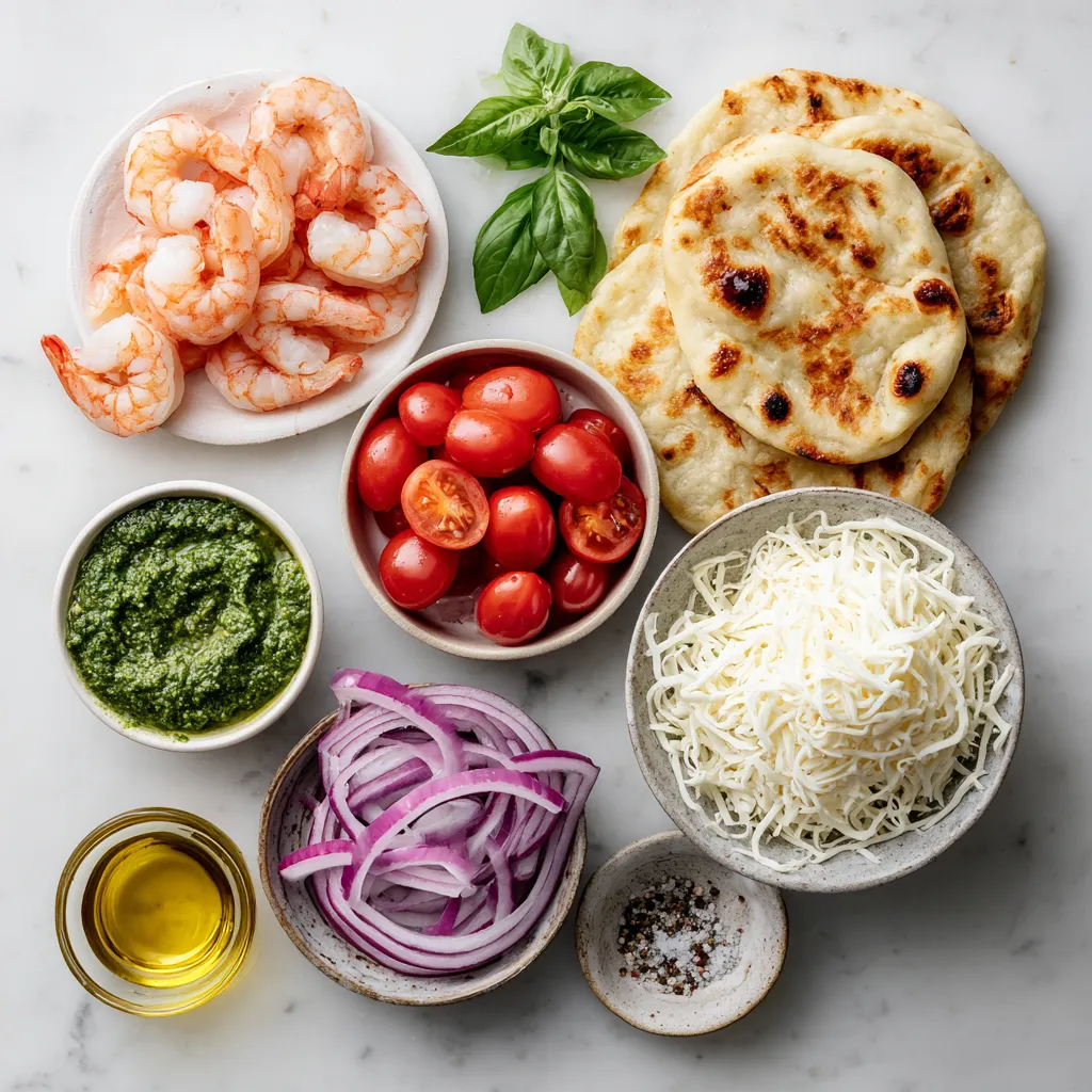For the base, I prefer naan bread or flatbread. Both options work well. They are soft and hold toppings nicely. Next, you’ll need basil pesto. You can buy it or make your own. Pesto adds a rich, herby flavor that blends well with shrimp.
