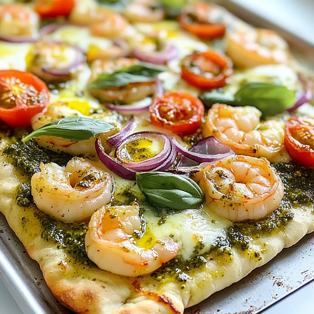 A delicious flatbread topped with pesto, shrimp, and cheese, perfect for a quick meal.
