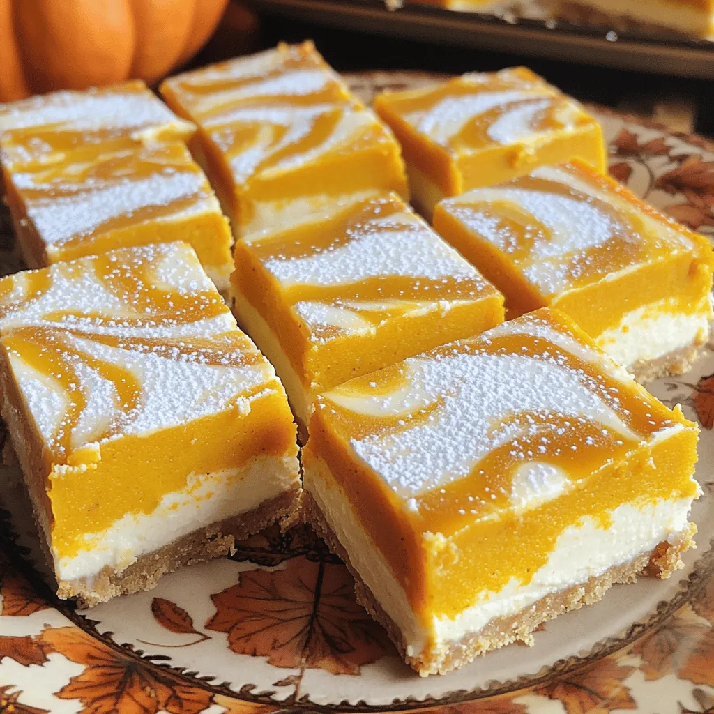 Spread half of the cream cheese mixture over the cooled crust. Then, add the pumpkin mixture on top of the cream cheese layer. Next, dollop the remaining cream cheese mixture over the pumpkin layer. Take a knife or toothpick and gently swirl the mixtures together. This creates a pretty marbled effect. Bake the bars for 30-35 minutes. The edges should set, and the center will be slightly jiggly. Allow them to cool to room temperature. Refrigerate for at least 2 hours before cutting into bars.