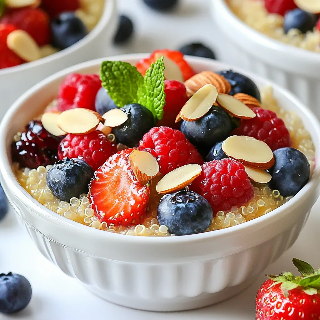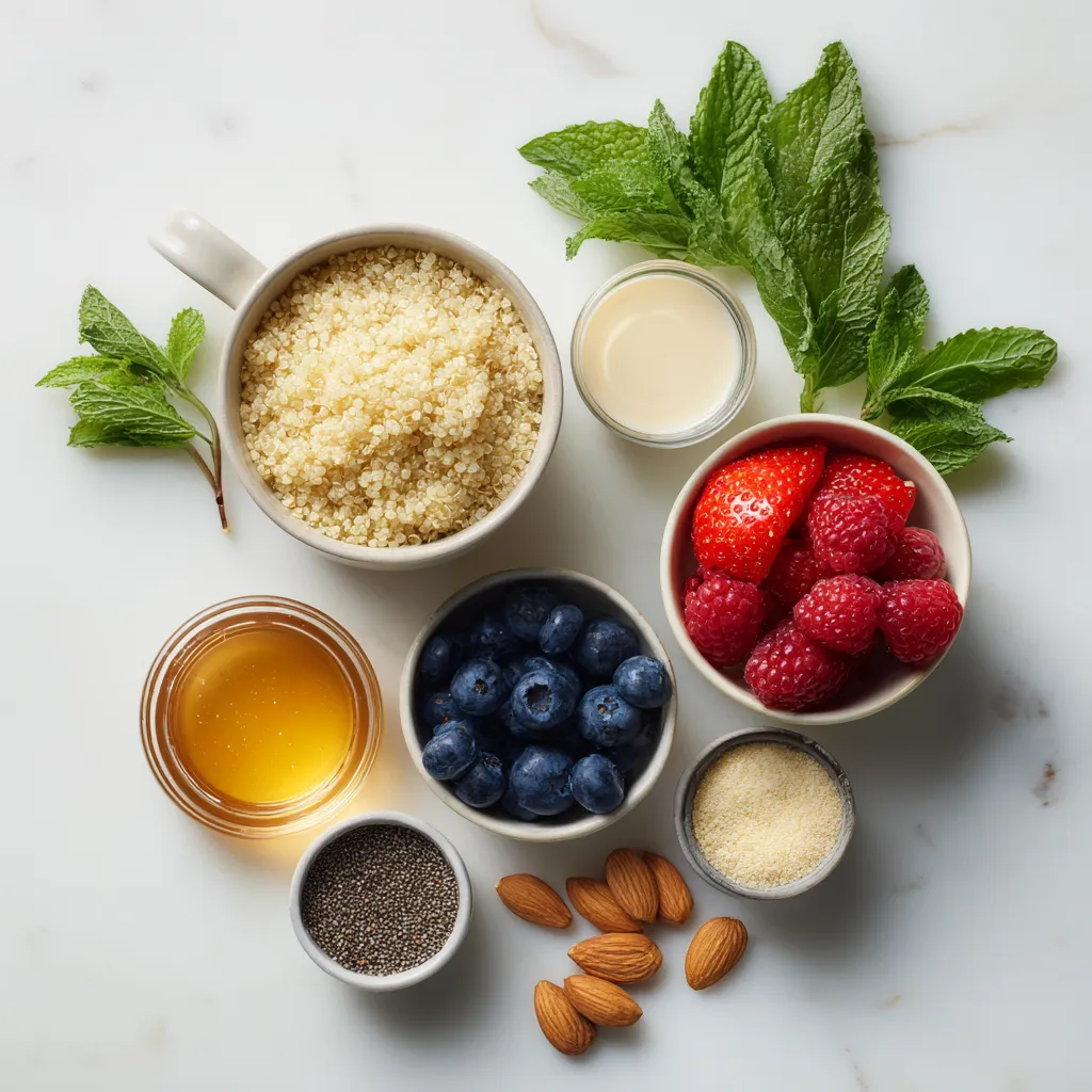 Each ingredient plays a key role. The quinoa serves as a protein-rich base. Berries add natural sweetness and antioxidants. Almond milk keeps the bowl creamy. Honey or maple syrup gives a touch of sweetness. Chia seeds add fiber and help thicken the bowl. Vanilla extract brings a warm flavor. Sliced almonds add crunch, and mint provides a fresh finish.