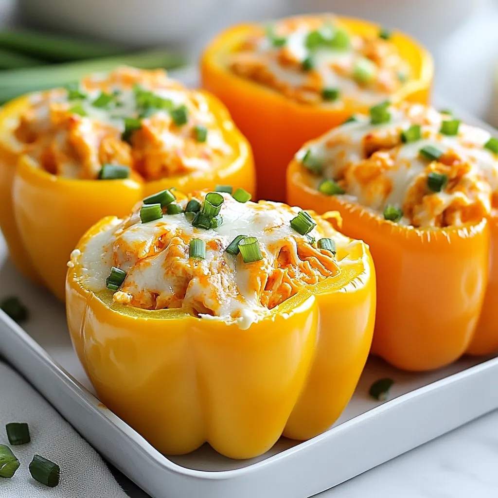 Delicious bell peppers stuffed with a spicy buffalo chicken mixture, perfect for a hearty meal.