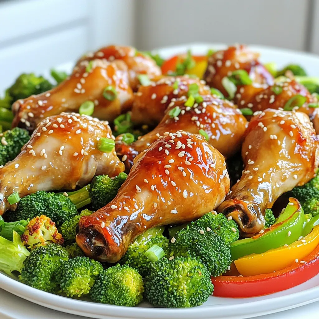 - 8 chicken drumsticks - 1/4 cup honey - 1/4 cup low-sodium soy sauce - 4 cloves garlic, minced - 1 tablespoon fresh ginger, grated - 1 tablespoon olive oil - Salt and pepper to taste - 1 teaspoon sesame seeds (for garnish) - 1/4 cup green onions, sliced (for garnish) - 2 cups broccoli florets - 1 bell pepper, sliced (any color) These ingredients come together to create a dish that is both sweet and savory. The combination of honey and soy sauce forms a lovely glaze for the chicken. Garlic gives a strong flavor, while ginger adds a nice warmth. Chicken drumsticks are perfect for this recipe because they stay juicy and tender when cooked. You can also adjust the amount of honey and soy sauce to suit your taste. If you want it sweeter, add more honey. For a saltier taste, use more soy sauce. Don't forget the veggies! Broccoli and bell peppers add color and crunch. They also balance the rich flavor of the chicken. You can swap in other vegetables if you like, but these choices work great. Now, gather these ingredients, and let’s get cooking! First, you need to preheat your oven to 425°F (220°C). This temperature helps cook the chicken evenly. Next, grab a large baking sheet. Line it with parchment paper or aluminum foil. This makes clean-up a breeze. In a bowl, whisk together these ingredients: - 1/4 cup honey - 1/4 cup low-sodium soy sauce - 4 cloves garlic, minced - 1 tablespoon fresh ginger, grated - 1 tablespoon olive oil - Salt and pepper to taste Make sure everything mixes well. Now, take your chicken drumsticks and place them in a large bowl or zip-lock bag. Pour the marinade over the chicken. Toss it well so each drumstick gets coated. Let it marinate for at least 15 minutes. For even better taste, marinate it in the fridge for up to 2 hours. While your chicken is soaking up the flavors, get your veggies ready. On the same baking sheet, place 2 cups of broccoli florets and 1 sliced bell pepper. Drizzle them with olive oil and season with salt and pepper. Toss everything to coat the veggies evenly. Once your chicken has marinated, arrange the drumsticks on the baking sheet with the veggies. Pour any leftover marinade over the chicken to boost flavor. Now it’s time to bake! Place the baking sheet in your preheated oven. Bake for about 30 to 35 minutes. Check that the chicken reaches an internal temperature of 165°F (75°C). This ensures it's safe to eat. Halfway through, turn the drumsticks for even cooking. For a crispy finish, switch the oven to broil for the last 2 to 3 minutes. Keep an eye on it to avoid burning. When done, remove from the oven and sprinkle 1 teaspoon of sesame seeds and 1/4 cup of sliced green onions on top for a fresh pop of flavor. Enjoy your meal! Marinating chicken is key to great flavor. I suggest marinating for at least 15 minutes. For even better taste, try marinating for 2 hours. Use a zip-lock bag for easy mixing. Make sure the marinade coats every piece well. Avoid using metal containers, as they can react with the marinade. Always refrigerate while marinating. This keeps the chicken safe and tasty. To get that perfect crispy skin, start with a hot oven at 425°F (220°C). Pat the chicken dry with a paper towel before marinating. This helps remove extra moisture. Place the drumsticks on the pan with space between them. This allows hot air to circulate. Halfway through baking, turn the drumsticks for even crispiness. For a final touch, broil for 2-3 minutes. Watch closely to prevent burning. Choosing fresh vegetables makes a big difference. Look for bright colors and firm textures. For broccoli, check for tight florets. Avoid yellowing or wilting. When picking bell peppers, feel for a firm skin. They should be heavy for their size. Always smell them; they should have a fresh scent. Fresh veggies add flavor and crunch to your dish. {{image_2}} You can switch up the veggies for a fun twist. Try using carrots, asparagus, or zucchini. These add color and crunch. They also soak up the honey garlic sauce. You can mix and match based on what you have. Just be sure to cut them to similar sizes for even cooking. Chicken drumsticks are great, but you can try other proteins. Bone-in chicken thighs work well too. They stay juicy and tender. If you want a lighter option, use skinless chicken breast. For a unique touch, try marinating shrimp instead. Just reduce cooking time since they cook fast. The honey garlic sauce is simple, but you can make it your own. Add a splash of rice vinegar for tanginess. If you like heat, mix in some chili flakes or Sriracha. For a deeper flavor, try adding hoisin sauce. This gives a nice sweetness and complexity. Play around until you find your favorite mix. To store leftovers, first let the chicken cool down. Place the drumsticks in an airtight container. Add the veggies in the same container if you like. This keeps all the flavors together. You can store leftovers in the fridge for up to four days. When you’re ready to eat, use the oven for reheating. Preheat it to 350°F (175°C). Place the chicken on a baking sheet. Cover it with foil to keep it moist. Heat for about 15–20 minutes. This way, the chicken stays juicy and the skin gets crispy again. If you want to save the leftovers for later, freezing is a great choice. Wrap each drumstick in plastic wrap. Then place them in a freezer-safe bag. Remove as much air as you can. You can freeze them for up to three months. When you are ready to eat, thaw in the fridge overnight before reheating. This keeps the taste fresh and yummy! Yes, you can use other cuts of chicken. Thighs and wings work great too. Just adjust the cooking time. Thighs may need an extra 5-10 minutes. Wings cook faster, so check them at 25 minutes. Marinate the chicken for at least 15 minutes. For deeper flavor, go for 2 hours in the fridge. The longer you marinate, the better the taste. Just don’t go over 24 hours, or the meat can turn mushy. You can serve many sides with honey garlic chicken. Here are s