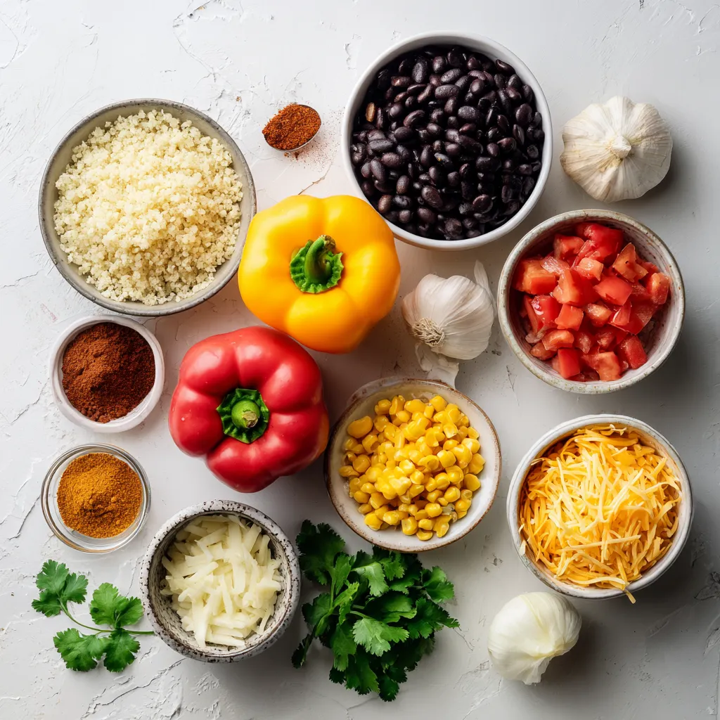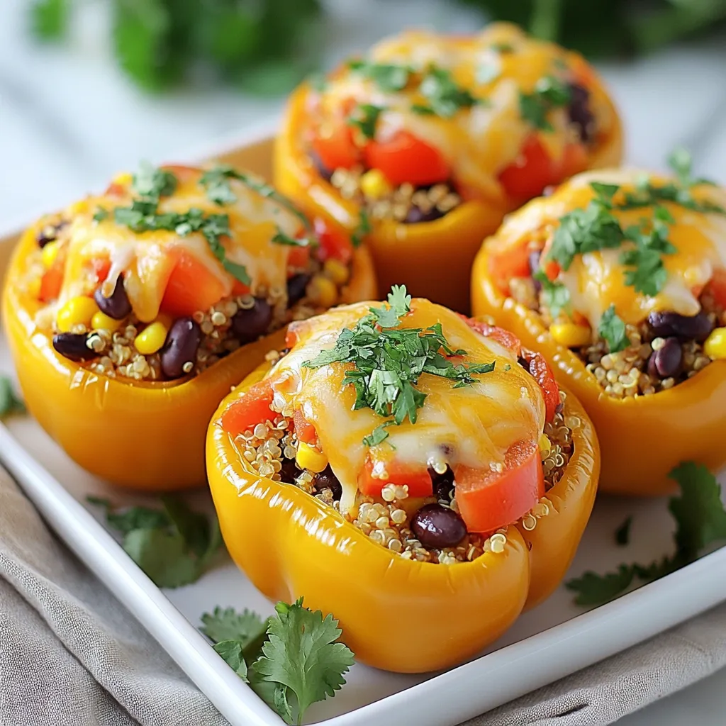 To make Southwest quinoa stuffed peppers, gather these ingredients: - 4 large bell peppers (any color) - 1 cup quinoa, rinsed - 2 cups vegetable broth - 1 can (15 oz) black beans, rinsed and drained - 1 cup corn kernels (fresh or frozen) - 1 medium onion, diced - 2 cloves garlic, minced - 1 teaspoon cumin - 1 teaspoon chili powder - ½ teaspoon smoked paprika - Salt and pepper to taste - 1 cup diced tomatoes (canned or fresh) - 1 cup shredded cheese (cheddar or pepper jack) - Fresh cilantro, for garnish You can add more flavor with these: - Avocado crema for drizzling - Sour cream for a creamy touch - Jalapeños for a spicy kick - Lime juice for brightness - Additional spices like oregano or cayenne If you have special diets, try these swaps: - Use quinoa or brown rice for gluten-free needs. - Replace black beans with pinto beans or lentils. - Use dairy-free cheese for a vegan option. - For lower sodium, choose low-sodium broth and beans. These choices keep your meal tasty and fit your needs! {{ingredient_image_1}} To make Southwest quinoa stuffed peppers, you need to prepare the peppers and the filling. You will cook the quinoa first. Next, you will mix it with tasty ingredients. Then, you will stuff the peppers and bake them. This process takes about 50 minutes. 1. Preheat your oven. Set it to 375°F (190°C). 2. Cook the quinoa. In a medium pot, boil 2 cups of vegetable broth. Add 1 cup of rinsed quinoa. Turn the heat low, cover, and simmer for 15 minutes. The quinoa will soak up all the broth. 3. Prep the peppers. Cut the tops off 4 large bell peppers. Remove the seeds and membranes. Place them cut side up in a baking dish. 4. Sauté the onion. Heat a tablespoon of olive oil in a large skillet. Add 1 diced onion. Cook for about 5 minutes until it is clear. 5. Add garlic. Stir in 2 minced cloves of garlic. Cook for 1 more minute until you smell the garlic. 6. Mix the filling. Add 1 can of black beans, 1 cup of corn, the cooked quinoa, and 1 cup of diced tomatoes. Also add 1 teaspoon of cumin, 1 teaspoon of chili powder, ½ teaspoon of smoked paprika, salt, and pepper. Stir everything well. 7. Stuff the peppers. Use a spoon to fill each pepper with the quinoa mix. Pack it in gently. 8. Top with cheese. Sprinkle 1 cup of shredded cheese on each stuffed pepper. 9. Bake the peppers. Cover the dish with foil. Bake for 25 minutes. Then, take off the foil and bake for 10 more minutes. The cheese should be bubbly and golden. 10. Garnish and serve. Take them out of the oven. Let them cool for a few minutes. Add fresh cilantro on top before you serve. Bake your stuffed peppers at 375°F (190°C). The total baking time is 35 minutes. First, cover with foil for 25 minutes. Then, uncover and bake for 10 more minutes. This ensures the peppers cook well and the cheese melts nicely. To cook quinoa well, start by rinsing it under cold water. This step removes the bitter coating called saponin. Next, use two cups of vegetable broth for one cup of quinoa. Bring the broth to a boil in a medium pot. Once boiling, add the quinoa, lower the heat, and cover the pot. Let it simmer for about 15 minutes or until the liquid absorbs. After cooking, remove it from heat and let it sit for five minutes. Fluff it with a fork for a light and airy texture. For stuffed peppers, cheese adds creaminess and flavor. I recommend using cheddar or pepper jack cheese. Cheddar gives a sharp taste, while pepper jack adds a spicy kick. You can also try Monterey Jack for a milder option. If you prefer a healthier choice, use reduced-fat cheese. For a dairy-free version, consider vegan cheese or nutritional yeast. Sprinkle the cheese on top of the stuffed peppers before baking for a golden and bubbly finish. When you serve these stuffed peppers, consider pairing them with a salad or rice. A fresh green salad with lime vinaigrette complements the flavors well. You can also serve it with avocado crema or a dollop of sour cream for added richness. If you want a heartier meal, consider adding a side of black beans or corn. This extra touch makes the meal feel more filling and balanced. Enjoy your colorful and tasty feast! Pro Tips Choose Colorful Peppers: Using a mix of red, yellow, and green bell peppers not only enhances the visual appeal but also provides a variety of flavors. Enhance Flavor with Spices: Feel free to adjust the spices according to your taste or add a pinch of cayenne pepper for an extra kick! Meal Prep Friendly: These stuffed peppers can be made ahead of time and stored in the fridge for up to 3 days, making them perfect for meal prep. Experiment with Toppings: Try adding avocado slices, jalapeños, or a sprinkle of lime juice on top before serving for an extra burst of flavor. {{image_2}} You can easily make these peppers vegetarian or vegan. For a vegan version, skip the cheese or use a plant-based cheese. You can also top the peppers with avocado instead. This keeps the dish creamy and delicious while sticking to vegan rules. Use vegetable broth for cooking quinoa to keep it plant-based. Want a kick? Add more spice! Use jalapeños or diced green chiles in the filling. You can sprinkle hot sauce on top before baking. For an extra kick, add cayenne pepper to the quinoa mix. This will make your stuffed peppers fiery and exciting! If you like meat, try adding ground turkey or chicken to the filling. Cook the meat in the skillet before mixing in the other ingredients. You can also use beef for a heartier meal. Just brown the meat first and mix it with quinoa and beans. This adds protein and flavor to your dish. After enjoying your Southwest quinoa stuffed peppers, let them cool. Place leftovers in an airtight container. You can store them in the fridge for up to three days. This keeps the flavors fresh and the peppers crisp. To reheat, take the peppers out of the fridge. Place them in a microwave-safe dish. Cover with a damp paper towel to keep moisture. Heat on medium for about two to three minutes. You can also rehea