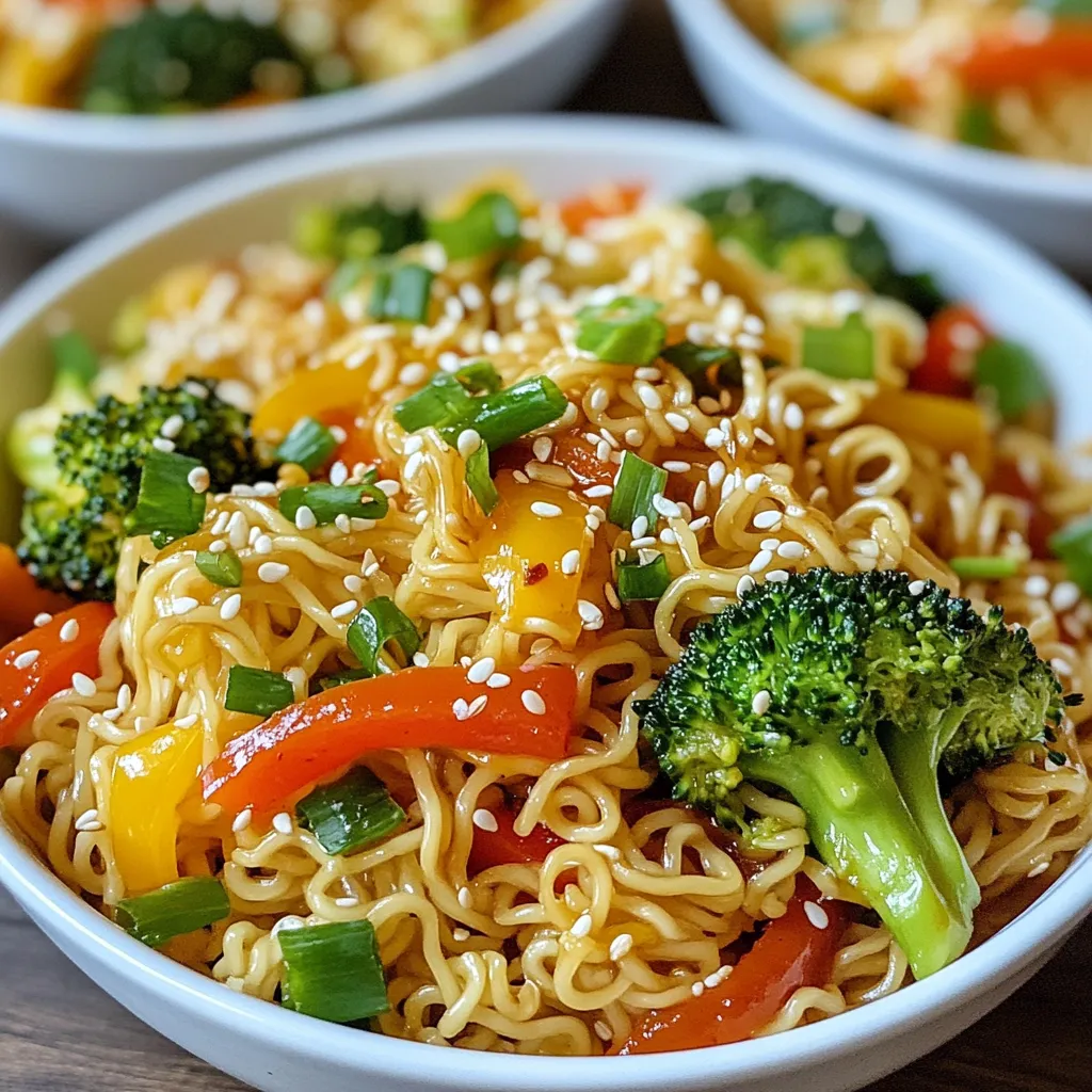 A quick and flavorful stir-fry featuring ramen noodles and a variety of fresh vegetables, spiced with garlic and sriracha.