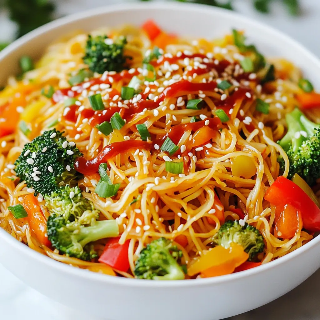 - 8 oz. rice noodles - 2 tablespoons sesame oil - 1 red bell pepper, thinly sliced - 1 cup broccoli florets - 1 carrot, julienned - 3 cloves garlic, minced - 1 tablespoon ginger, grated - 3 tablespoons soy sauce - 2 tablespoons Sriracha (adjust to taste) - 1 tablespoon honey or maple syrup - 2 green onions, chopped - Sesame seeds, for garnish The rice noodles are the base of the dish. They soak up the sauce well. Sesame oil gives a nice, nutty flavor. It adds depth to the dish. Red bell pepper adds sweetness and bright color. Broccoli florets bring crunch and nutrients. Carrots add a sweet taste and chewy texture. Garlic and ginger give warmth and spice. Soy sauce adds saltiness and umami. Sriracha is key for heat and flavor. Honey or maple syrup balance the spice. Green onions add freshness on top. Sesame seeds are a lovely garnish that adds a crunch. You can swap rice noodles for whole wheat noodles if preferred. Use olive oil instead of sesame oil for a different flavor. If you do not have red bell pepper, try yellow or orange peppers. Zucchini or snap peas can replace broccoli. If you don't have fresh ginger, use ground ginger, but use less. For a gluten-free option, use tamari instead of soy sauce. If you like it sweeter, try agave nectar in place of honey or maple syrup. {{ingredient_image_1}} First, you need to cook the rice noodles. Follow the package instructions carefully. Usually, this takes about 4 to 6 minutes. Check for the "al dente" texture. When done, drain the noodles in a colander. Rinse them with cold water to stop the cooking process. Set them aside for later. This step keeps the noodles from being too soft. Next, let’s prepare the vegetables. Start by slicing the red bell pepper into thin strips. Then, cut the broccoli into small florets. For the carrot, julienne it into long, thin pieces. You want everything to cook evenly. Mince the garlic and grate the ginger. These add great flavor to your dish. Keep everything ready to go. This makes cooking faster and easier. Now, let’s make the spicy Sriracha sauce. In a small bowl, mix together soy sauce, Sriracha, and honey or maple syrup. Adjust the Sriracha to your taste if you like it spicier. Stir everything well until combined. This sauce will bring all the flavors together. Once mixed, your sauce is ready for the next step! To cook rice noodles just right, follow these steps: - Boil water in a large pot. - Add the noodles and stir gently. - Cook until they are al dente, about 4-6 minutes. - Drain and rinse the noodles with cold water. - This stops the cooking and keeps them firm. These noodles can get sticky fast, so keep them moving. You can toss them with a bit of sesame oil after rinsing. Sriracha packs a punch. To adjust the heat: - Start with 1 tablespoon of Sriracha in your sauce. - Taste and then add more if you want it hotter. - You can also balance the heat with honey or maple syrup. These sweeteners help tone down the spice while adding flavor. If you want less heat, skip the Sriracha or use a milder sauce. Presentation matters! Here are some fun ideas: - Serve your noodles in deep bowls for a cozy feel. - Sprinkle extra sesame seeds on top for crunch. - Drizzle more Sriracha for a vibrant look. - Add lime wedges on the side for a zesty kick. This not only looks great but also adds to the taste. Your guests will love the visual appeal! Pro Tips Adjust the Spice Level: If you prefer a milder dish, start with 1 tablespoon of Sriracha and gradually add more to your taste. Use Fresh Vegetables: Fresh vegetables not only enhance flavor but also add a vibrant color to your dish, making it more visually appealing. Garnish Creatively: Experiment with garnishes like chopped cilantro, crushed peanuts, or a squeeze of fresh lime for additional flavor and texture. Make it a Meal: Add protein like shrimp, chicken, or tofu to turn this dish into a complete meal that’s both satisfying and nutritious. {{image_2}} You can easily make Spicy Sriracha Noodles vegetarian or vegan. Start with rice noodles, which are plant-based. For a vegan sauce, simply use maple syrup instead of honey. You can also add more vegetables, like snap peas or mushrooms. They bring great texture and flavor. This way, you keep it healthy and colorful. If you want extra protein, chicken, tofu, or shrimp work well. For chicken, cut it into bite-sized pieces. Cook it in sesame oil before adding garlic and ginger. For tofu, use firm tofu, cut into cubes. Sauté it until golden before adding veggies. Shrimp cooks fast; just add it after the garlic and ginger. Cook it until it turns pink. Each option adds a different flavor and makes the dish more filling. You can change the flavor to fit your taste. If you like sweet, add more honey or maple syrup. For a tangy twist, squeeze fresh lime juice over the noodles before serving. You could also mix in a bit of peanut butter for a creamy texture. Try adding crushed peanuts for crunch. This keeps the dish fun and exciting every time you make it. To keep your Spicy Sriracha Noodles fresh, place them in an airtight container. Make sure to cool the noodles to room temperature first. Store them in the fridge for up to three days. This way, they stay tasty and ready for your next meal. When reheating, you want to keep the noodles soft. Use a microwave-safe dish. Add a splash of water to prevent drying. Cover it with a lid or a damp paper towel. Heat for one to two minutes. Stir halfway to warm evenly. You can also reheat in a skillet. Just add a bit of oil and toss until hot. If you want to save your noodles for later, freezing works well. First, let them cool completely. Then, place the noodles in a freezer-safe bag. Remove any air before sealing. They can last up to three months in the freezer. When ready to eat, thaw in the fridge overnight. Reheat using the tips above for best results. You can serve Spicy Sriracha Noodles with many tasty sides. Try spring rolls for a crunchy bite. A side salad adds freshness a