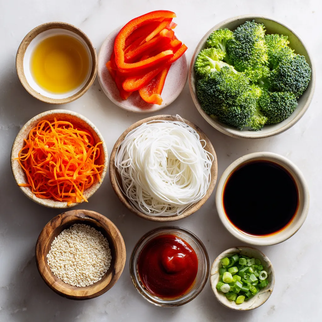 The rice noodles are the base of the dish. They soak up the sauce well. Sesame oil gives a nice, nutty flavor. It adds depth to the dish. Red bell pepper adds sweetness and bright color. Broccoli florets bring crunch and nutrients. Carrots add a sweet taste and chewy texture. Garlic and ginger give warmth and spice. Soy sauce adds saltiness and umami. Sriracha is key for heat and flavor. Honey or maple syrup balance the spice. Green onions add freshness on top. Sesame seeds are a lovely garnish that adds a crunch.