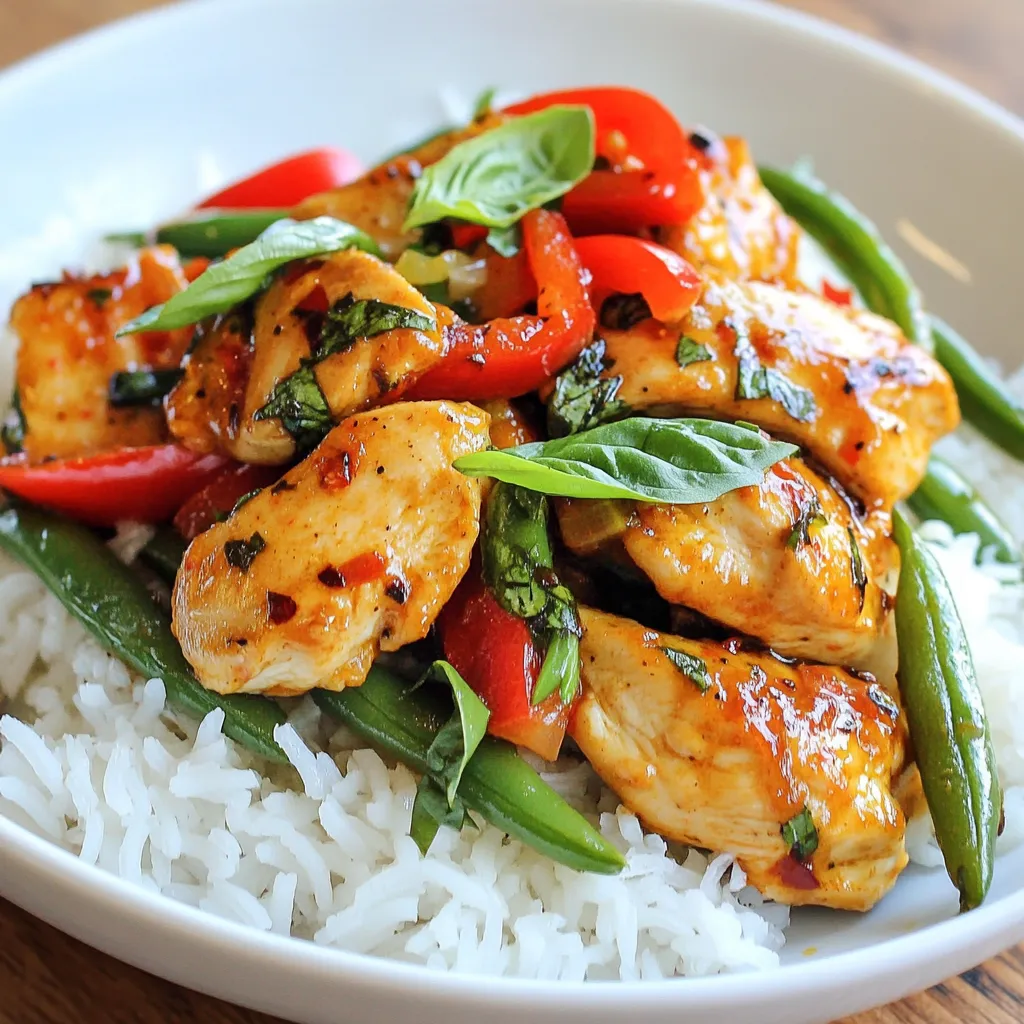 A flavorful stir-fry dish featuring chicken, fresh Thai basil, and a spicy sauce.