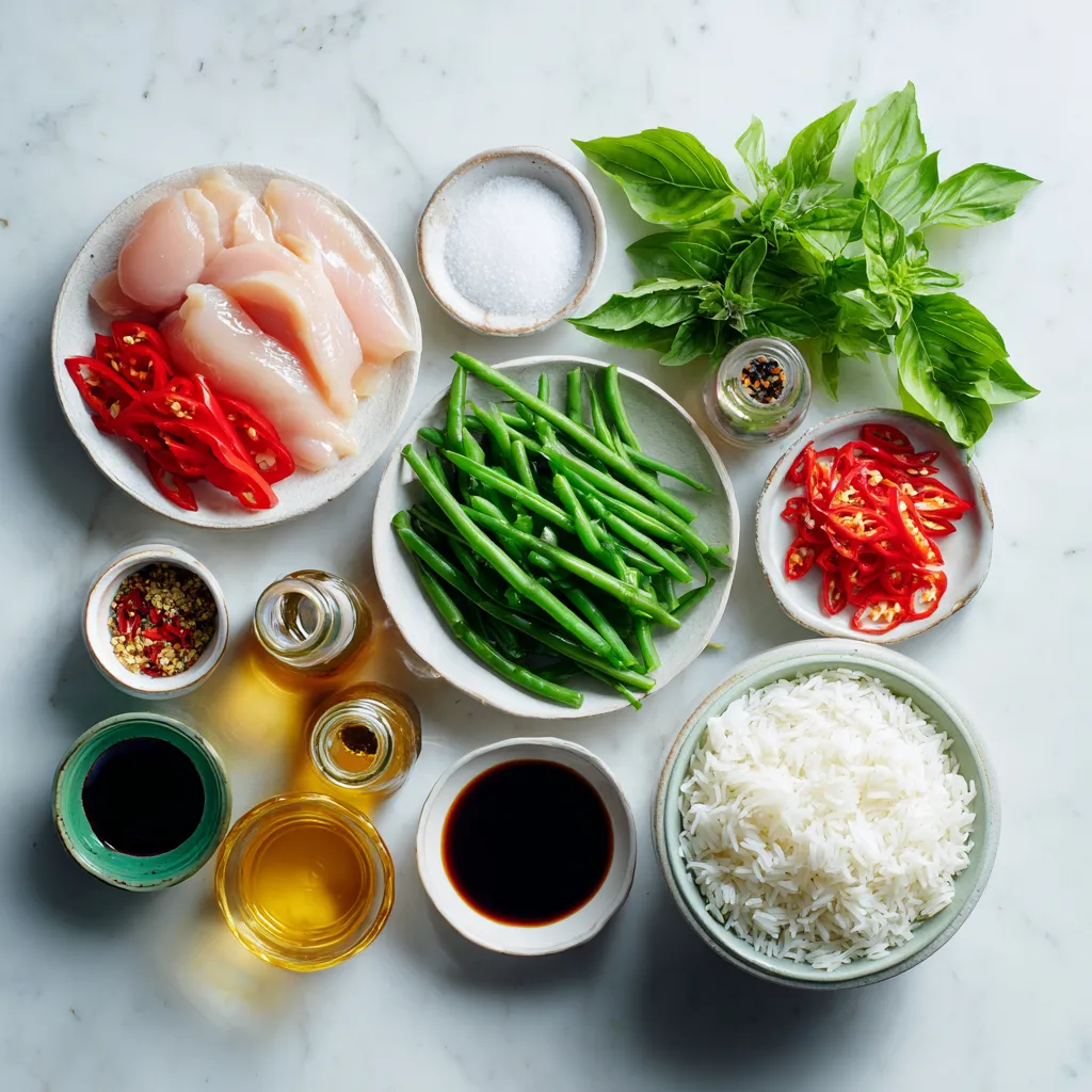 When making Spicy Thai Basil Chicken, I like to gather all my ingredients first. You need fresh chicken breast for the best texture. I choose thin slices because they cook fast and soak up flavors well.