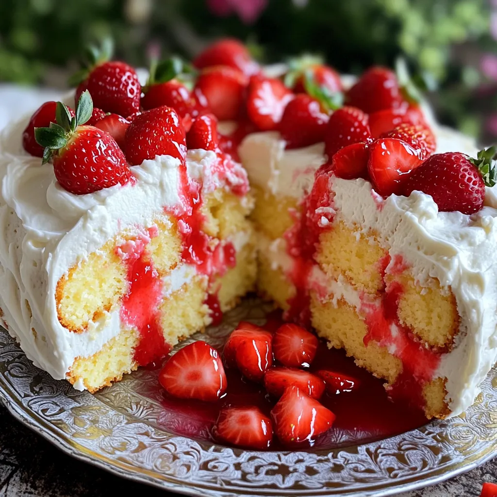 To make a tasty Strawberry Cheesecake Poke Cake, you need these key ingredients: - 1 box vanilla cake mix - 3 large eggs - 1/2 cup vegetable oil - 1 cup water - 1 (8 oz) package cream cheese, softened - 1 cup powdered sugar - 1 teaspoon vanilla extract - 1 1/2 cups whipped topping - 1 cup fresh strawberries, diced - 1 cup strawberry sauce (store-bought or homemade) - Extra strawberries for garnish These ingredients work together to create a soft cake with a creamy topping. The vanilla cake mix gives a nice base, while the cream cheese adds richness. If you don’t have some ingredients, don’t worry! Here are some easy swaps: - Cake Mix: You can use lemon or strawberry cake mix for a twist. - Cream Cheese: Neufchâtel cheese is a lighter option. - Whipped Topping: You can use homemade whipped cream or even Greek yogurt for a healthier choice. - Strawberry Sauce: If you lack strawberry sauce, use raspberry or blueberry sauce instead. These swaps keep the cake delicious while allowing for flexibility. Garnishes can add flair to your cake. Here are some fun ideas: - Sprinkle crushed graham crackers on top for a cheesecake vibe. - Add a drizzle of chocolate sauce for extra sweetness. - Use mint leaves for a fresh touch. - Serve each slice with a dollop of whipped topping. These ideas help personalize the cake and make it even more appealing. Enjoy creating your own version! Start by gathering your ingredients. You will need a box of vanilla cake mix, eggs, vegetable oil, and water. Also, have cream cheese, powdered sugar, vanilla extract, and whipped topping ready. Don’t forget fresh strawberries and strawberry sauce. Preheat your oven to 350°F (175°C). Grease and flour a 9x13 inch baking pan to prevent sticking. In a large mixing bowl, combine the cake mix, eggs, vegetable oil, and water. Mix until smooth. Pour the batter into the prepared pan. Bake for 25-30 minutes. Check with a toothpick. If it comes out clean, the cake is done. Let the cake cool in the pan for about 15 minutes. Once the cake is cool, use a wooden spoon handle or a fork to poke holes all over the top. Make sure the holes go deep but not all the way through. In another bowl, mix the softened cream cheese, powdered sugar, and vanilla extract. Blend until creamy. Gently fold in the whipped topping until combined. Spread this mixture over the cake, filling the holes. Drizzle strawberry sauce on top and add diced strawberries. Cover the cake and refrigerate for at least 3 hours, or overnight for the best flavor. To keep your cake moist, use the right amount of water. The recipe calls for 1 cup. This amount helps the cake stay soft. Make sure you don’t overbake it. Bake just until a toothpick comes out clean. This usually takes 25 to 30 minutes. Let the cake cool in the pan for a bit. This helps it stay moist before you poke holes. Poking holes is key to a great poke cake. Use the handle of a wooden spoon or a fork. Press down firmly but don’t reach the bottom. Space the holes about one inch apart. This helps the strawberry sauce soak in well. The cream cheese layer will fill the holes later. This way, every bite is packed with flavor. When it’s time to serve, make it special! Top each slice with a whole strawberry. Add a dollop of whipped topping for a creamy touch. You can also drizzle more strawberry sauce on top. Serve it nice and cold after refrigerating. This makes the cake refreshing and delicious. Enjoy sharing it with friends and family! {{image_2}} You can switch up the strawberries for other fruits. Try blueberries, raspberries, or peaches. Each fruit gives a new taste and look. Blueberries add a burst of flavor. Raspberries bring a nice tartness. Peaches add a sweet and juicy touch. Mix fruits for a colorful topping. Your cake will look vibrant and inviting. Love chocolate? You can make a chocolate version. Use a chocolate cake mix instead of vanilla. The cream cheese layer stays the same. You can add chocolate sauce on top. Drizzle it over the cream cheese layer. Then, top with chocolate shavings or mini chocolate chips. This twist will please any chocolate lover. Want a gluten-free poke cake? Use a gluten-free cake mix. Follow the same steps as before. Make sure your cream cheese and toppings are gluten-free too. Fresh fruits and whipped topping are usually safe. This allows everyone to enjoy a slice. You won't lose flavor or texture with this version. To store leftover cake, cover it tightly with plastic wrap. This keeps it fresh and moist. You can also use an airtight container. Place it in the fridge to keep it cool. It should stay good for about 4 to 5 days. If you want to freeze the cake, cut it into slices first. Wrap each slice in plastic wrap, then place it in a freezer bag. Remove as much air as possible. This will help prevent freezer burn. The cake can last up to three months in the freezer. When ready to eat, thaw it in the fridge overnight. To keep your cake fresh, always store it in the fridge. Avoid leaving it out at room temperature for long. If using strawberries as a garnish, add them right before serving. This keeps them looking fresh and tasty. Enjoy your Strawberry Cheesecake Poke Cake at its best! Yes, you can make this cake ahead of time. I often prepare it the day before serving. This lets the flavors mix well. The longer it sits, the tastier it becomes. Just keep it covered in the fridge until you are ready to serve. You can use frozen strawberries if fresh ones are not available. Just thaw and drain them well before using. Canned strawberries work too. Be sure to rinse them and cut them into small pieces. You can also use other fruits like blueberries or raspberries for a twist. The cake stays fresh for about 3 to 5 days in the fridge. Make sure to cover it well. If you see any signs of spoilage, throw it out. I recommend enjoying it within the first few days for the best taste and texture. Absolutely! You can switch out the vanilla cake mix for chocolate or lemon. Each flavor