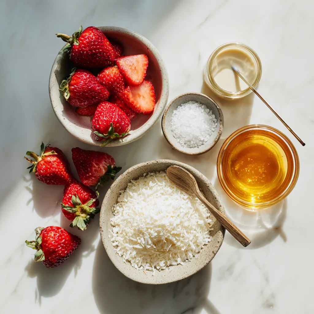• In a mixing bowl, combine the blended strawberries with coconut milk, honey or maple syrup, vanilla extract, shredded coconut, and a pinch of sea salt.