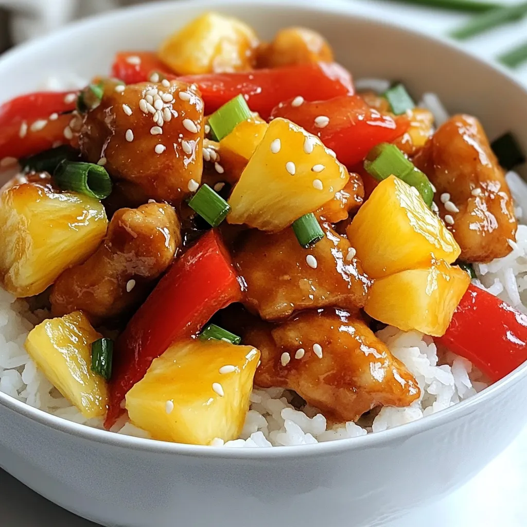 A delicious stir fry featuring chicken, bell peppers, and pineapple in a sweet and tangy sauce.
