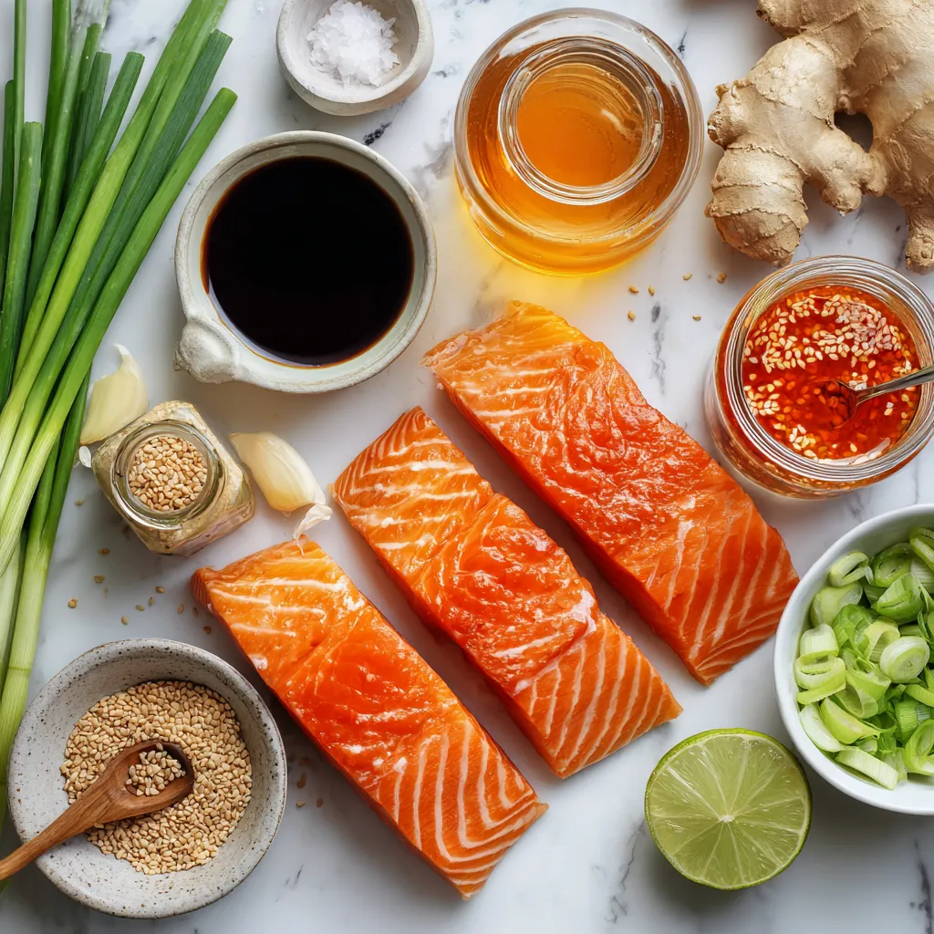 You need four salmon fillets, each about six ounces. Sweet chili sauce adds a nice kick. You’ll also use soy sauce, honey, ginger, garlic, and lime juice. Don’t forget salt and pepper for flavor. To cook, you will need sesame oil. For garnishing, sesame seeds and green onions work great.