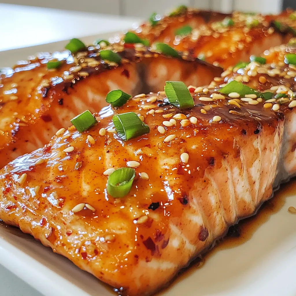 A delicious salmon dish glazed with sweet chili sauce, perfect for a quick and flavorful meal.