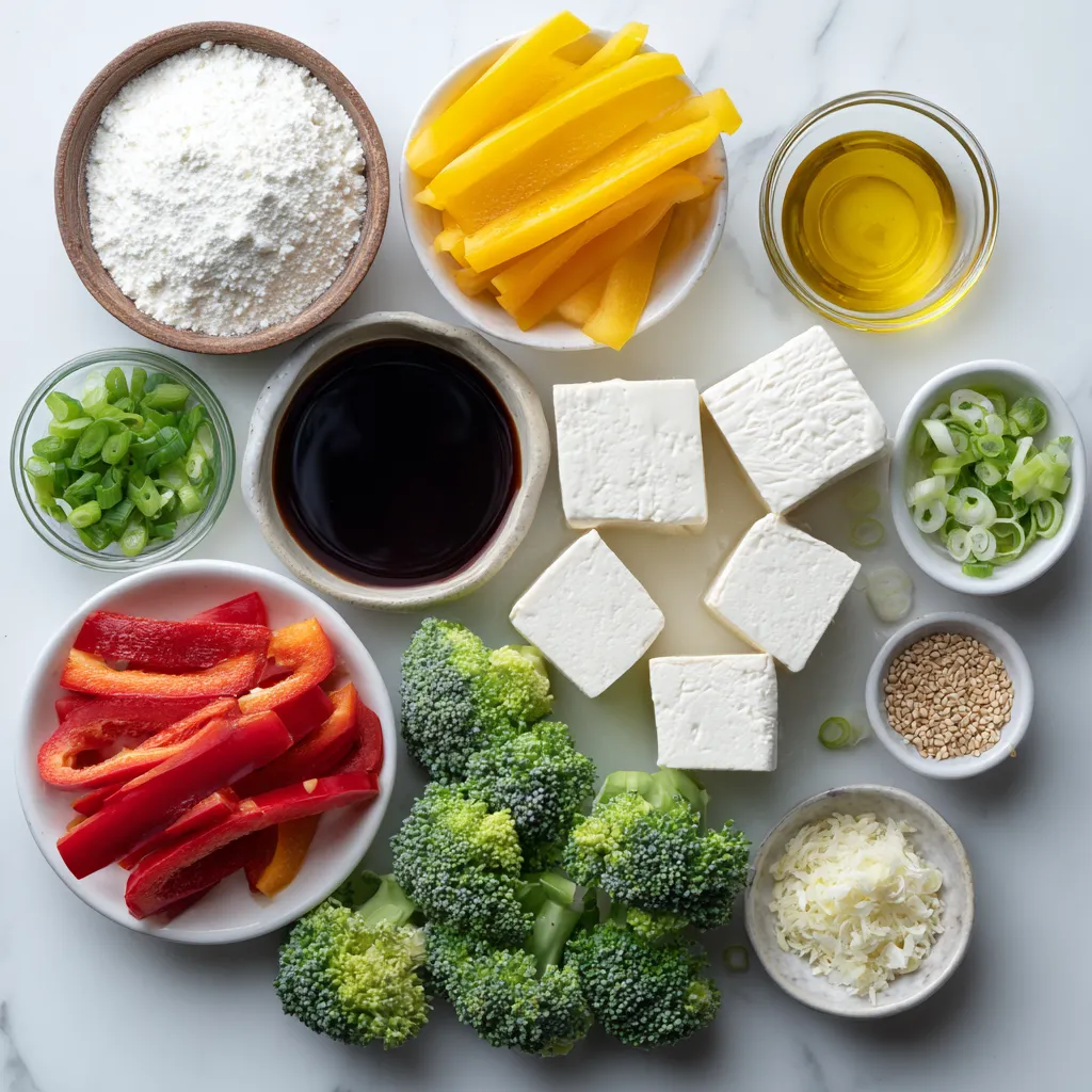 Cornstarch coats the tofu. It helps achieve that golden, crunchy texture when cooked. Fresh vegetables, like bell peppers and broccoli, add color, flavor, and nutrition.