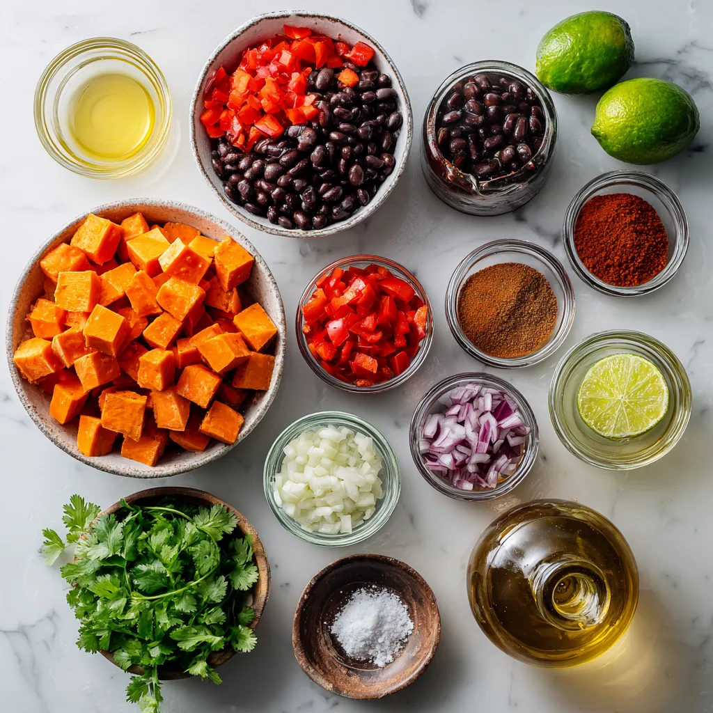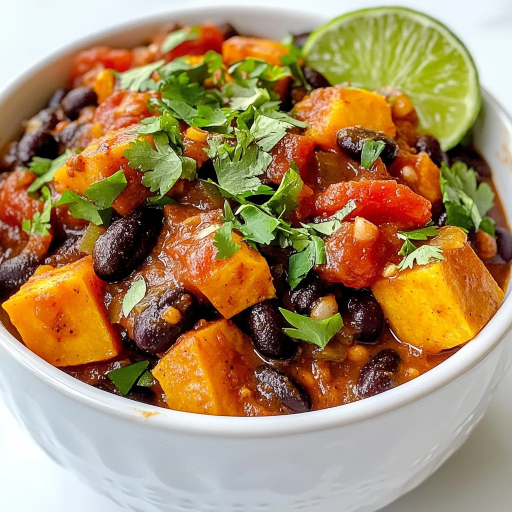 - 2 medium sweet potatoes, peeled and diced - 1 can (15 oz) black beans, drained and rinsed - 1 can (14 oz) diced tomatoes with green chilies - 1 medium onion, finely chopped - 3 cloves garlic, minced - 1 bell pepper (any color), chopped - 2 cups vegetable broth - 2 teaspoons ground cumin - 1 teaspoon smoked paprika - 1 teaspoon chili powder - 1/2 teaspoon cayenne pepper (adjust to taste) - Salt and pepper to taste - 1 tablespoon olive oil - 1 lime, juiced - Fresh cilantro for garnish I love using fresh sweet potatoes. They add a nice sweetness and texture. You can swap them with regular potatoes if you want. Canned black beans save time. If you prefer dried beans, soak them overnight and cook them first. Use any bell pepper color; each adds its own twist. For the tomatoes, choose ones with added green chilies for heat. If you want less spice, skip the cayenne pepper. Fresh cilantro brightens the dish, so don’t skip it! Each serving has about: - Calories: 240 - Protein: 10g - Carbohydrates: 50g - Fiber: 15g - Fat: 4g - Sodium: 400mg This chili is not just tasty; it's also packed with nutrients! Sweet potatoes provide vitamins and fiber. Black beans add protein and more fiber. You get a hearty meal that feels good and tastes great. {{ingredient_image_1}} First, gather all your ingredients. You will need: - 2 medium sweet potatoes, peeled and diced - 1 can (15 oz) black beans, drained and rinsed - 1 can (14 oz) diced tomatoes with green chilies - 1 medium onion, finely chopped - 3 cloves garlic, minced - 1 bell pepper (any color), chopped - 2 cups vegetable broth - 2 teaspoons ground cumin - 1 teaspoon smoked paprika - 1 teaspoon chili powder - 1/2 teaspoon cayenne pepper (adjust to taste) - Salt and pepper to taste - 1 tablespoon olive oil - 1 lime, juiced - Fresh cilantro for garnish Next, peel and dice the sweet potatoes. Chop the onion and bell pepper. Mince the garlic. Rinse the black beans. This prep makes your cooking smooth and fun. Start by heating the olive oil in a large pot or Dutch oven over medium heat. Add the chopped onion and bell pepper. Cook them for about five minutes until they soften. Then, add the minced garlic. Cook it for another minute. This step brings out the aroma. Next, toss in the diced sweet potatoes. Stir them well to mix with the onions and peppers. Pour in the vegetable broth, diced tomatoes (with their juices), and black beans. Stir everything together. Season the chili with cumin, smoked paprika, chili powder, cayenne pepper, salt, and pepper. Stir well again. Bring the chili to a boil. Once it boils, reduce the heat to low, cover the pot, and let it simmer. Cook for 25-30 minutes until the sweet potatoes are tender. Stir occasionally, so nothing sticks to the pot. When ready, taste the chili. You can adjust the seasoning if needed. Squeeze in the lime juice and mix it well. This adds a bright flavor. Always taste your chili before serving. If it needs more spice, add more cayenne pepper. For more depth, add an extra dash of smoked paprika. If it feels too thick, just add a bit more vegetable broth. For garnish, sprinkle fresh cilantro on top before serving. You can also add a lime wedge on the side. This makes your dish look great and adds flavor. Enjoy your hearty and healthy meal! To make the best sweet potato black bean chili, start with fresh ingredients. Fresh sweet potatoes bring a natural sweetness. Use ripe tomatoes for a richer flavor. Always rinse canned beans to reduce sodium. Cook the chili low and slow for deep taste. Stir often to avoid sticking. Add layers of flavor by using spices wisely. Ground cumin and smoked paprika add warmth. Adjust cayenne pepper for your spice level. A squeeze of lime brightens the dish. For extra texture, top with crunchy tortilla chips. Fresh cilantro adds a nice herbaceous note. Try adding corn for a sweet pop. Don’t skip sautéing the onions and peppers; this builds flavor. Avoid overcooking the sweet potatoes, or they may turn mushy. Be cautious with salt; taste before adding more. If it’s too thick, add more broth. Lastly, don’t forget to taste and adjust before serving. Pro Tips Choosing Sweet Potatoes: Opt for firm, smooth sweet potatoes without any blemishes to ensure the best flavor and texture. Enhancing Flavor: For a deeper flavor, consider roasting the sweet potatoes before adding them to the chili. Adjusting Heat: If you prefer your chili spicier, feel free to add more cayenne pepper or include chopped jalapeños. Make-Ahead Option: This chili can be made ahead of time; it tastes even better the next day after the flavors have melded together. {{image_2}} This chili is naturally vegan. It has no meat and uses plant-based ingredients. The sweet potatoes and black beans give it a hearty texture. You can add more beans or even lentils for extra protein. Feel free to skip the lime juice if you prefer. Good news! This chili is gluten-free. All the ingredients are safe for a gluten-free diet. Just make sure to check the labels on canned goods. Some brands may add gluten as a thickener. Use a gluten-free vegetable broth to keep it safe. You can make this chili your own. Try adding corn for a sweet crunch. Chopped zucchini or carrots can add more veggies. For a spicy kick, toss in jalapeños or habaneros. Fresh herbs like parsley or basil can brighten the dish. You might even add quinoa for more texture and protein. Each change can make your chili unique and delicious! To store your leftover sweet potato black bean chili, let it cool first. Once cooled, transfer it into an airtight container. Make sure to seal it well to keep air out. You can keep it in the fridge for up to five days. Label the container with the date, so you know when it was made. If you want to freeze the chili, it’s simple. Place the cooled chili in freezer-safe containers or heavy-duty bags. Leave some space at the top because liquids expand when frozen. Your chili will stay fresh for up to three months. When you are ready to