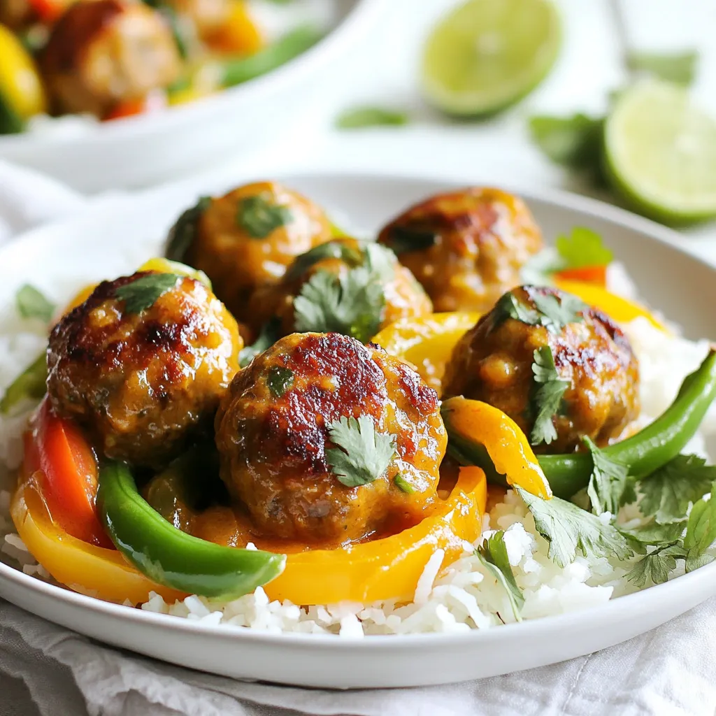 For the meatballs, you need: - 1 pound ground chicken or turkey - 1/2 cup breadcrumbs - 1/4 cup fresh cilantro, chopped - 1 tablespoon ginger, grated - 2 cloves garlic, minced - 1 tablespoon fish sauce - 1 tablespoon lime juice - 1 tablespoon red curry paste - Salt and pepper to taste These ingredients combine to create juicy meatballs with a burst of flavor. The ginger and garlic add warmth, while the fish sauce gives it depth. Lime juice brings brightness, and red curry paste adds the signature Thai heat. For the curry sauce, you will need: - 1 can (14 oz) coconut milk - 1 cup vegetable broth - 1 bell pepper, sliced (any color) - 1 cup snap peas The coconut milk provides a creamy base. The vegetable broth adds richness. Sliced bell peppers and snap peas bring color and crunch to the dish. Together, they make a vibrant and tasty curry sauce. Garnishes can make your dish shine. Consider: - Cooked jasmine rice (for serving) - Lime wedges (for garnish) Jasmine rice serves as the perfect bed for the meatballs. Squeezing lime juice on top enhances the dish's flavors. These simple touches elevate the meal and make it visually appealing. {{ingredient_image_1}} To start, grab a large bowl. Add 1 pound of ground chicken or turkey. Next, mix in 1/2 cup of breadcrumbs and 1/4 cup of fresh cilantro, chopped. Then, add 1 tablespoon of grated ginger and 2 cloves of minced garlic. Don't forget 1 tablespoon of fish sauce and 1 tablespoon of lime juice. Now, stir in 1 tablespoon of red curry paste along with salt and pepper to taste. Mix everything gently until combined. You want the flavors to blend without overworking the meat. Now, let's shape the mixture into meatballs. Roll the mixture into 1-inch balls. You should get about 20 meatballs. Place each meatball on a lined baking sheet. Preheat your oven to 400°F (200°C). Bake the meatballs for 15 to 20 minutes. They should turn golden brown and be cooked through. This step gives them a nice crust and keeps them juicy inside. While the meatballs bake, it’s time to make the sauce. Heat a large skillet over medium heat. Pour in 1 can of coconut milk and 1 cup of vegetable broth. Stir these together well. Next, add in sliced bell pepper and snap peas. Bring this mix to a gentle simmer and cook for about 5 minutes. This step softens the vegetables and helps their flavors shine through. Once the meatballs are done, gently place them into the simmering sauce. Let them simmer for another 5 minutes. This allows the meatballs to soak up the rich flavors of the curry. Taste your dish and adjust the seasoning. Add more curry paste if you want extra heat. Serve the meatballs over a bed of cooked jasmine rice. Drizzle the curry sauce on top for a delicious finish. For a fresh touch, garnish with lime wedges. This adds a zesty kick to each bite. Enjoy your flavorful Thai red curry meatballs! To keep meatballs moist, use ground chicken or turkey. These meats are lean and can dry out. Mix in breadcrumbs and fresh cilantro for added moisture. Don't overmix the meatball mixture. Just combine until all ingredients blend. This helps keep them tender. Baking at 400°F (200°C) for 15-20 minutes gives a nice crust. Use a meat thermometer to check for a safe internal temperature of 165°F (74°C). When cooking curry, use full-fat coconut milk for creaminess. It adds richness to the sauce. Heat the coconut milk and vegetable broth slowly. Stir often to prevent sticking. Add sliced bell pepper and snap peas to keep them crunchy. Simmer gently for 5 minutes to soften the veggies without losing their color. Once the meatballs are in the sauce, let them simmer for 5 more minutes. This allows all the flavors to mix well. To adjust spice levels, start with the red curry paste. Add a tablespoon for mild heat. If you want more spice, stir in extra curry paste. Taste as you go to find your perfect balance. You can also add lime juice for brightness. It helps cut the heat and adds flavor. Keep some lime wedges handy when serving. They make a great garnish and add a fresh twist. Pro Tips Use Fresh Ingredients: Always opt for fresh herbs and vegetables to enhance the flavor of your curry. Fresh cilantro and crisp bell peppers make a significant difference. Adjust the Spice Level: If you like it spicier, feel free to add more red curry paste or a chopped chili to the sauce. You can adjust the heat to your preference! Let it Simmer: Allow the meatballs to simmer in the sauce for a few extra minutes to absorb all the rich flavors of the curry. This step is crucial for a tasty dish. Serve with Lime: Don’t skip the lime wedges! A squeeze of fresh lime juice over the meatballs just before eating brightens up the dish and adds a refreshing touch. {{image_2}} You can easily make a vegetarian version of Thai red curry meatballs. Use lentils or chickpeas in place of meat. Start with 1 cup of cooked lentils or mashed chickpeas. Mix them with breadcrumbs, cilantro, ginger, garlic, and red curry paste. Form the mixture into meatballs. Bake them just like the original recipe. The flavors will still shine through in the curry sauce. Feel free to switch proteins in this recipe. Ground beef or pork works well. Use the same amount, one pound. For a vegan twist, try using plant-based ground meat. It's a great substitute and keeps the flavor intact. Just remember to adjust the seasoning to suit the protein you choose. You can change up the vegetables in the curry too. Broccoli, zucchini, or carrots are great options. Use about 1 cup of your chosen vegetable, sliced. They will add color and nutrition to the dish. Just add them to the sauce as you would the bell pepper and snap peas. Each vegetable brings its own unique taste to the curry. Store leftover meatballs in an airtight container. Keep them in the fridge. They will last for about three days. Make sure to let them cool before sealing. This helps keep them fresh and tasty. To freeze meatballs, place them on a baking sheet. Make sure they are not 