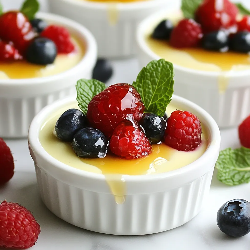 Now, pour the panna cotta mix into cups or ramekins. Place them in the refrigerator. Let them chill for at least 4 hours until they set. While they chill, prepare the berries. In a bowl, mix 1 cup of fresh berries with 2 tablespoons of honey. Let them sit for 15-20 minutes. This makes the berries sweeter and creates a tasty syrup. Once the panna cotta is firm, take them out and top with the berries. Enjoy your creamy, delicious treat!