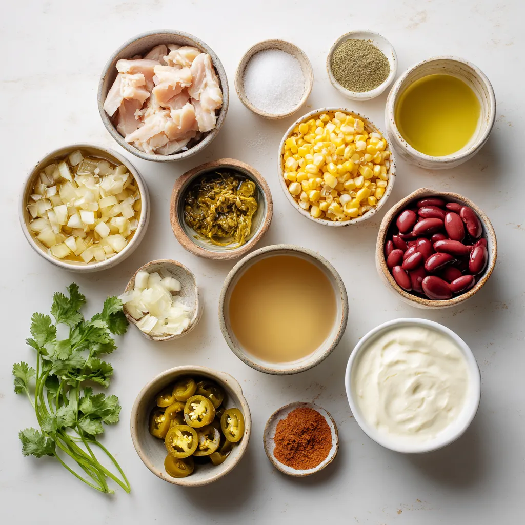 The main ingredients create a hearty base for the chili. Chicken breasts give it protein and flavor. White beans add creaminess and fiber. Frozen corn brings sweetness and color to the dish.